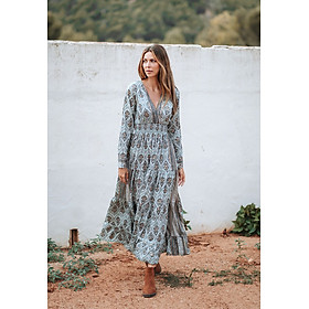 Maxi Boho Dài Tay Kết Cườm Cotton Isla Bonita, chất liệu cotton cao cấp, mềm mại, nổi bật phần ngực trước kết cườm sang trọng. Họa tiết thổ cẩm độc đáo. Phom suông. Dài Đầm