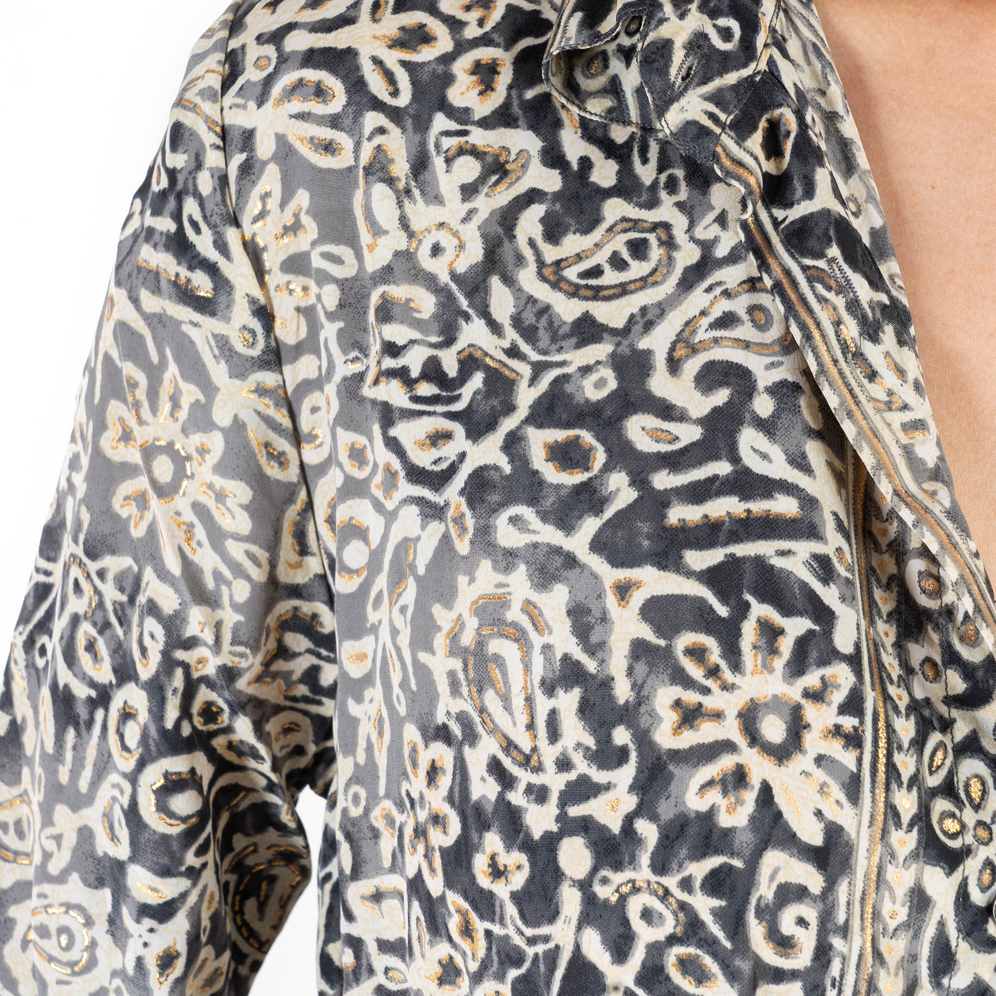Maxi sơ mi chất lụa cao cấp mềm mại, họa tiết ánh kim nổi bật. Có dây cột eo. Lưng thun co gĩan. Phần tay ôm. Phom rộng. Dài 130cm (45x130). Tay ôm Phù hợp