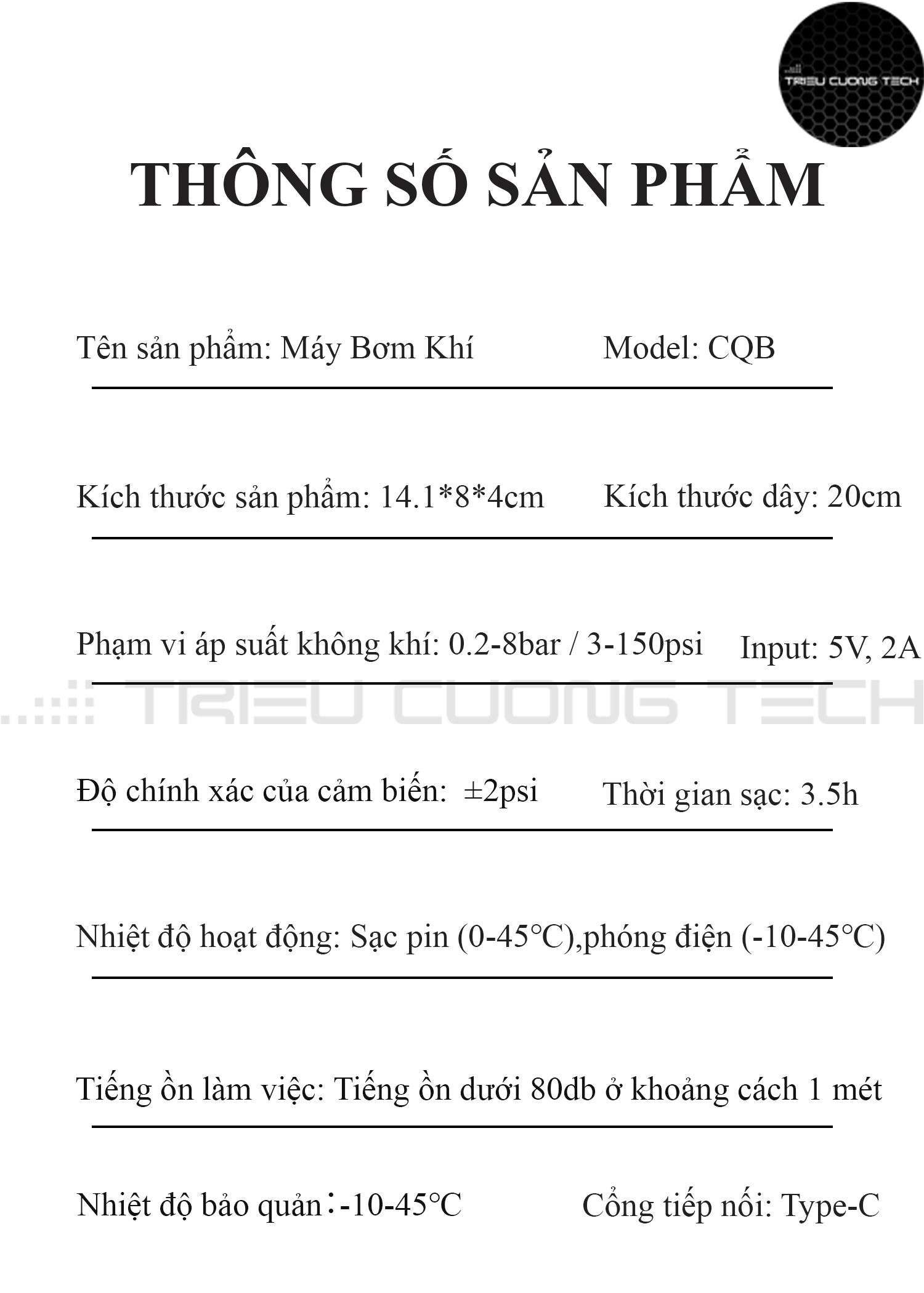 THÔNG SỐ SẢN PHẨM  - Model: CQB04 - Kích thước sản phẩm: 14.1*8*4cm - Kích thước dây: 20cm - Dung lượng pin: 2000mAh - Phạm vi áp suất không khí: 0.2-8bar / 3-150psi - Input: