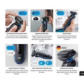 Mua tại Tiktok- Sản xuất tại Đức. Pin Lithium-ion, sạc đầy trong 50 phút, sử dụng đến 3 tuần cạo. Sạc nhanh 5 phút cho 1 lần cạo. Bảo hành 6 tháng. - Hãng sản xuất Braun - Thương hiệu Germany - Nơi sản xuất Germany - Chất liệu Nhựa cao cấp, thép không gỉ + Với 3 lưỡi dao linh hoạt, ôm sát các đường nét trên khuôn mặt giúp cạo sát hơn + Hệ thống EasyClean giúp cạo sạch nhanh chóng và dễ dàng + Pin Li-ion cho đến 3 tuần cạo, sạc nhanh 5 phút cho 1 lần cạo + Kèm theo đầu tỉa ria mép và mai + Dao cạo điện chống nước 100% cho cạo ướt và cạo khô + Thiết kế để cạo khô, cạo bọt, gel và trong vòi hoa sen