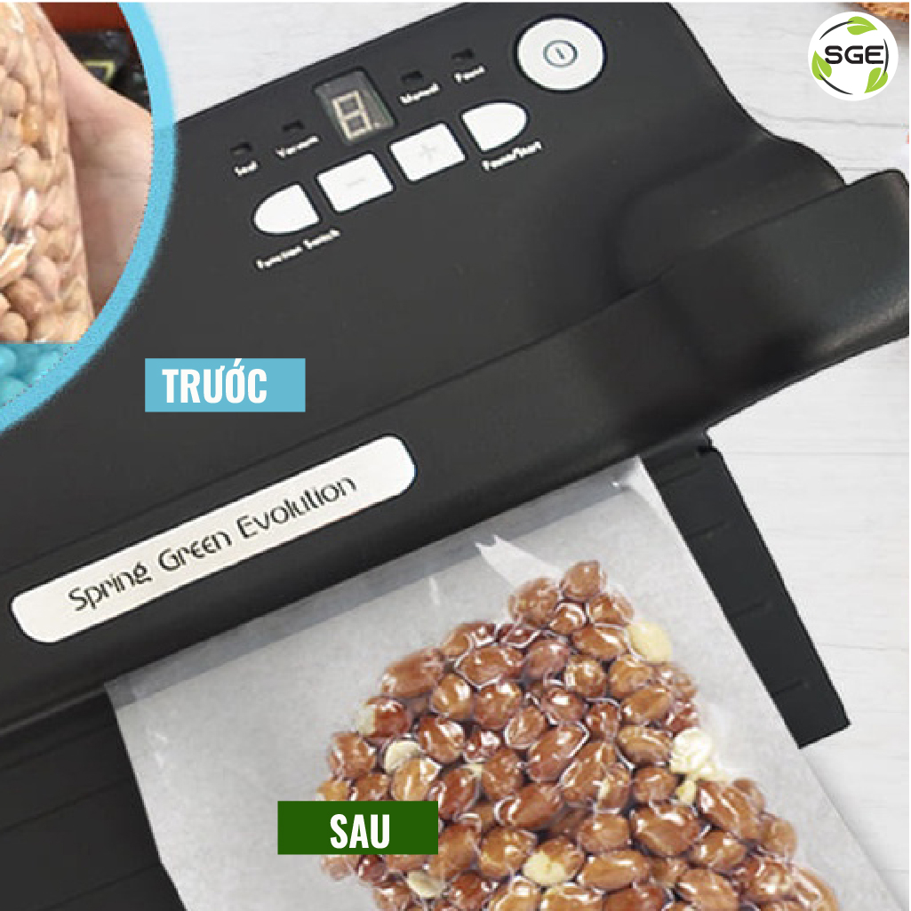 Sử dụng máy hút chân không sẽ giúp hút toàn bộ không khí bên trong túi đựng thực phẩm cũng như hàn kín miệng túi, hạn chế quá trình oxy hóa, sự phát triển của