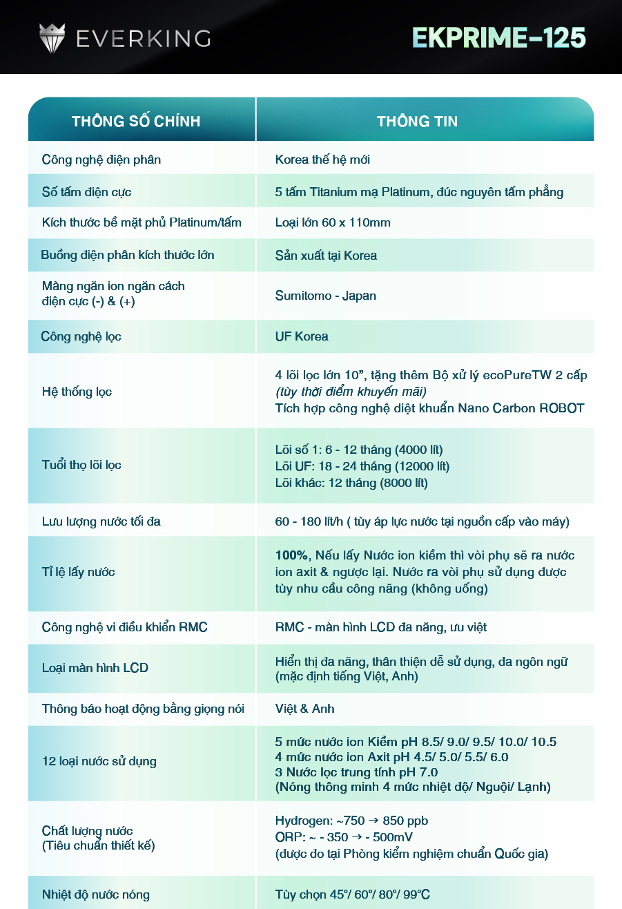 - 3 Nước lọc trung tính pH 7.0 (Nóng thông minh 4 mức nhiệt độ/Nguội/Lạnh) Chất lượng nước đạt chỉ số tối ưu, nồng độ Hydro hoạt tính lên đến ~ 750 -> 850 ppb, chống oxy hóa (ORP) lên đến ~ -350 -> -500 mV, chỉ số lý tưởng của máy lọc nước điện giải ion kiềm, được kiểm nghiệm trực tiếp tại Phòng Thí Nghiệm chuyên nghiệp cấp quốc gia. Chỉ số Hydrogen, ORP của nước tùy thuộc số tấm điện cực, đặc tính nguồn nước & “điều kiện đo trong phòng thí nghiệm chuyên nghiệp, đạt chuẩn”. Tích hợp chức năng Nóng – Lạnh đầy tiện ích – Đạt Kỷ Lục Châu Á & Thế Giới – Bản quyền phát minh sáng chế Công nghệ vi điều khiển RMC/LCD tiên tiến, khác biệt vượt trội: Đỉnh cao công nghệ điện phân Korea Hệ thống đa cấp lọc hoàn hảo EVERKING EKPrime-125 được tích hợp công nghệ UF tiên tiến lọc nước trung tính, với hệ thống lọc đa cấp sản xuất Hàn Quốc & công nghệ diệt khuẩn Nano Carbon (ROBOT) vẫn “giữ được các khoáng chất tự nhiên của nước cho quá trình điện phân tạo nước điện giải bền vững 24/24 suốt vòng đời của máy”. Kiểu dáng hiện đại thiết kế thông minh Máy lọc nước điện giải EVERKING EKPrime-125 có kiểu dáng vô cùng độc đáo, duy nhất thị trường - phù hợp mọi không gian như nhà bếp, phòng ăn, phòng khách, văn phòng, Với sắc màu xanh trắng cẩm thạch chủ đạo, sản phẩm tạo nên cảm giác sang trọng, thư thái và đẳng cấp cho người sử dụng. Giá thành phải chăng cho mọi nhà Nếu so sánh với các sản phẩm nhập khẩu EVERKING EKPrime-125 có chất lượng vượt trội, đạt chuẩn quốc tế, nhưng giá thành siêu tiết kiệm. Đặc biệt, chi phí thay lõi lọc cũng luôn được nhà sản xuất đảm bảo trong mức dưới 2.000.000đ/năm. Kết hợp chế độ bảo hành chính hãng, luôn sẵn có vật tư linh kiện thay thế nhanh chóng với mức phí ưu đãi nhất. CHỨNG NHẬN CHẤT LƯỢNG EVERKING EKPrime-125 đạt các chứng nhận cấp quốc tế, Thiết bị Y Tế & An Toàn Điện Châu Âu CE, đăng ký FDA, xác lập Kỷ Lục Việt Nam, Châu Á & Thế Giới, Đĩa Vàng Sáng Tạo Thế Giới, đăng ký bản quyền sáng chế tại Quốc Tế.
