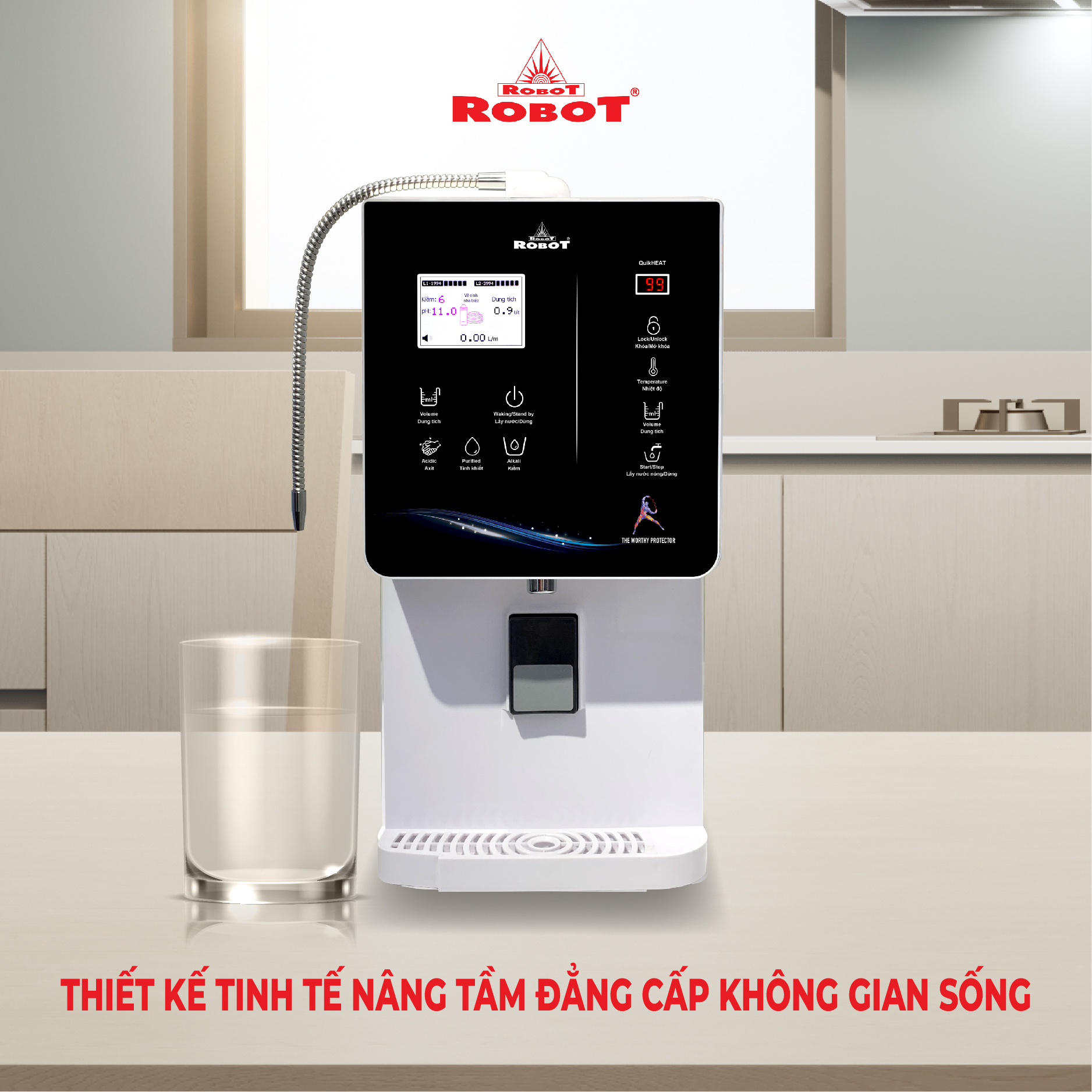 - tạo 11 loại nước bổ ích, pH 4.5 ---> 10.5 - Đáp ứng mọi nhu cầu trong cuộc sống Có thể tham khảo ý kiến của Bác sĩ hoặc chuyên gia dinh dưỡng để được hướng dẫn loại nước uống phù hợp nhất cho cơ thể. Kiểu dáng hiện đại - Thiết kế chinh phục mọi không gian