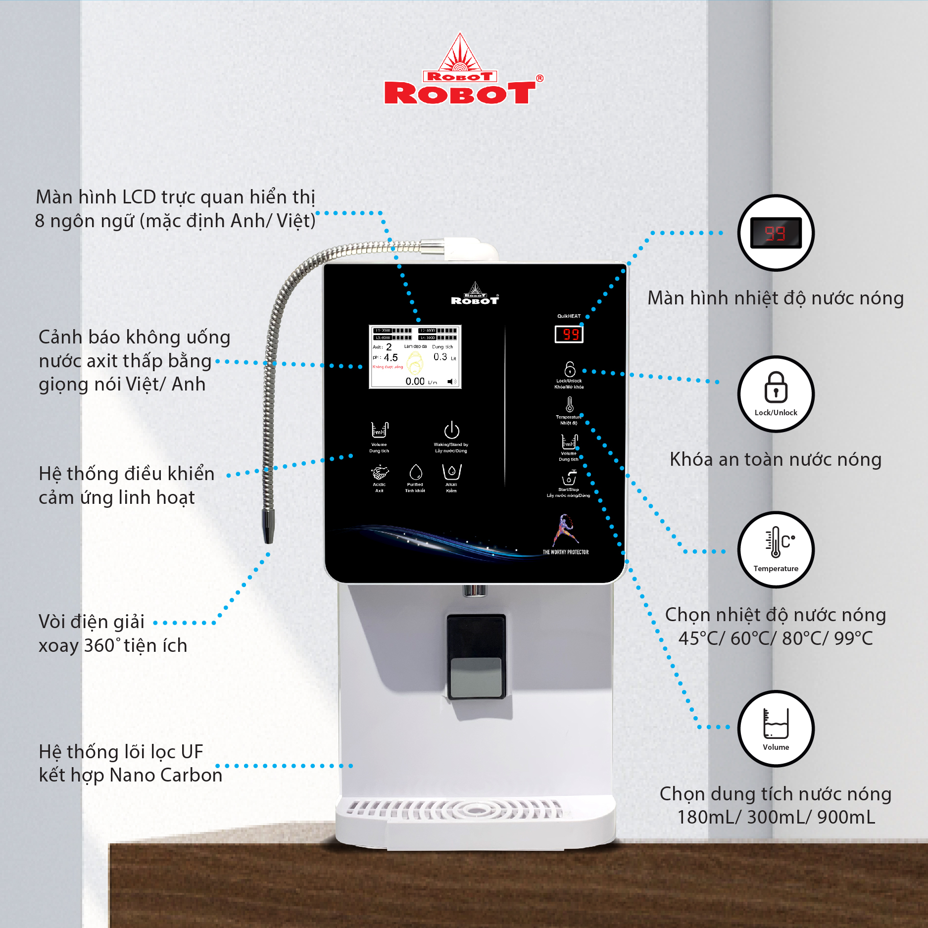 - Và 3 mức nước iON axit (pH 4.5/5.0/5.5). Chất lượng nước đạt chỉ số tối ưu, nồng độ Hydro hoạt tính lên đến ~ 750 -> 850 ppb, chống oxy hóa (ORP) lên đến ~ -350 -> -500 mV, đáp ứng mọi nhu cầu sử dụng trong cuộc sống. Máy lọc nước điện giải iON kiềm Nóng Lạnh ROBOT ionQueen là dòng Để Bàn đầu tiên trên thế giới, được thiết kế kiểu dáng hiện đại, thiết kế chinh phục mọi không gian. Đặc biệt, được tích hợp thêm chức năng Nóng Thông Minh – Lạnh độc đáo & duy nhất trên thị trường, mang lại nhiều tiện ích cho người dùng. Chỉ số Hydrogen, ORP của nước tùy thuộc số tấm điện cực, đặc tính nguồn nước & “điều kiện đo trong phòng thí nghiệm chuyên nghiệp, đạt chuẩn”. Máy lọc nước điện giải iON kiềm Nóng Lạnh ROBOT ionQueen 511,