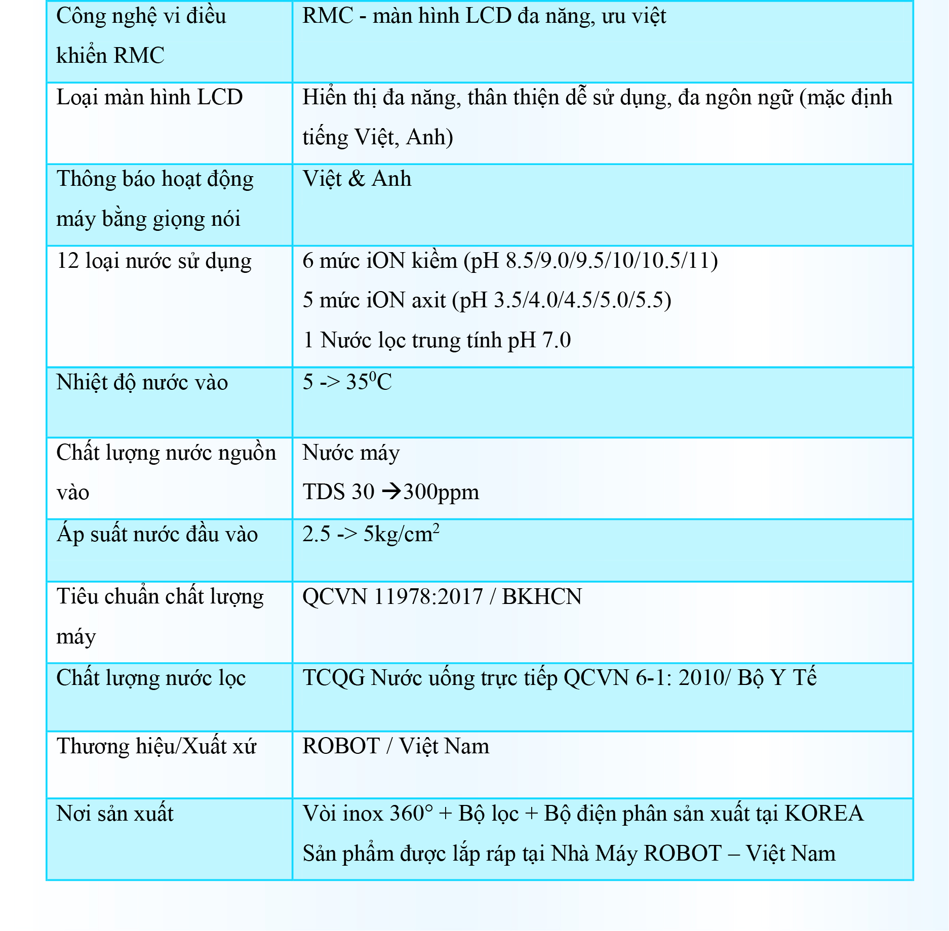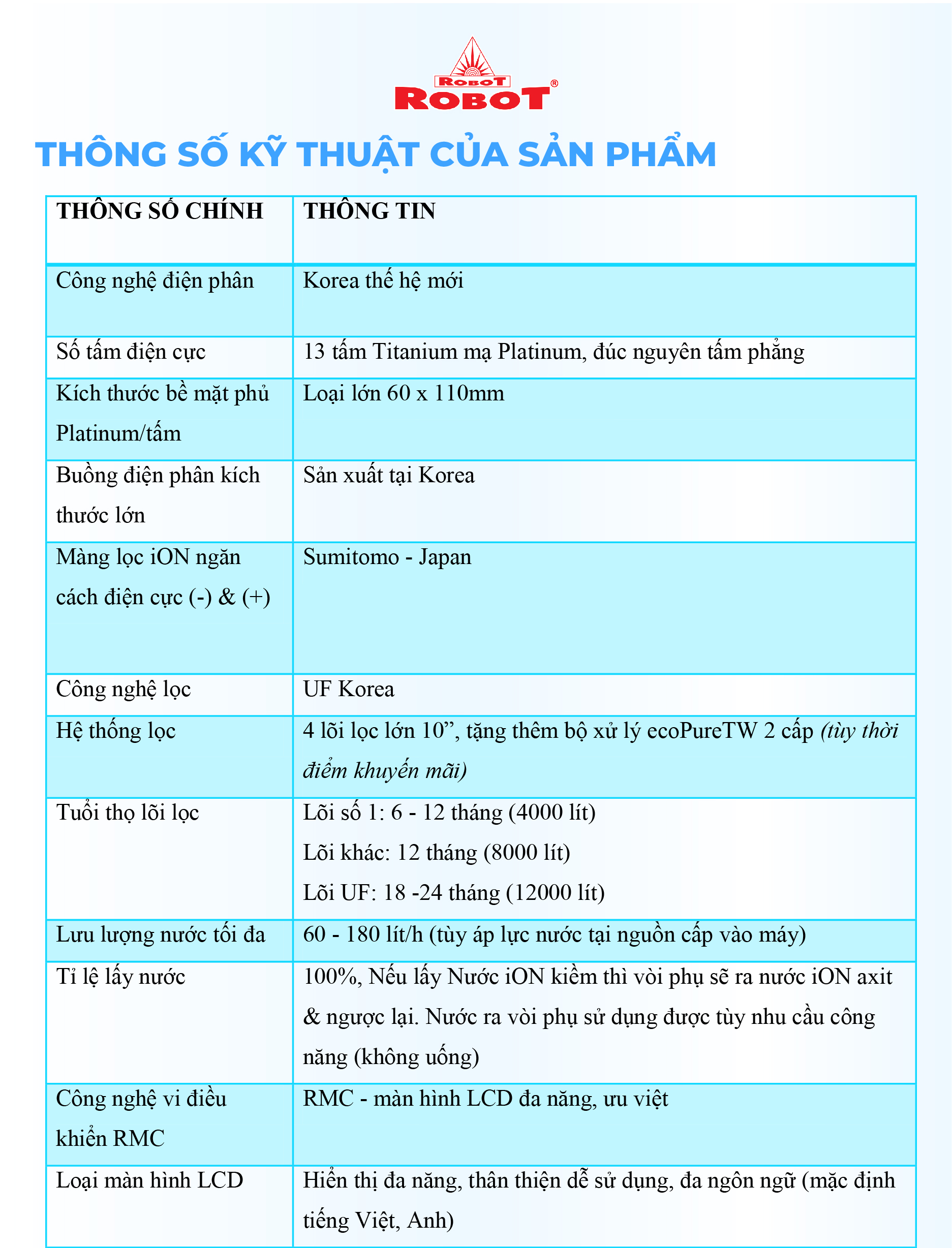 Hệ thống điều khiển cảm ứng trên mặt phủ kính với màn hình LCD tinh tế     Với mong muốn nhiều gia đình Việt có thể sử dụng nước điện giải iON kiềm với chi phí hợp lý để bảo vệ sức khỏe, sắc đẹp & nâng cao chất lượng cuộc sống, ROBOT mang đến sản phẩm “Chất lượng Quốc tế - Giá thành Việt Nam”, phù hợp với mức sống của nhiều người. Tiết kiệm cho người tiêu dùng đến hơn một nửa chí phí so với máy nhập khẩu chỉ từ 30 – 50%, nhưng sở hữu nhiều ưu điểm, tính năng vượt trội, chất lượng cao.  Chế độ bảo hành chính hãng, tận nơi, vật tư và linh kiện, lõi lọc luôn có sẵn hạn chế tối đa chi phí sửa chữa, bảo trì.     VĐV Cầu Lông Nguyễn Tiến Minh – tay vợt từng đứng Top 5 Thế Giới chia sẻ: Sau một thời gian sử dụng Máy lọc nước điện giải iON kiềm Minh thấy cải thiện sức khỏe rất nhiều và tốc độ hồi phục sau tập luyện, thi đấu cũng nhanh hơn so với trước đây. Bây giờ mỗi khi đi tập, hay khi đi thi đấu, Minh đều mang theo nước iON kiềm để uống. ROBOT là một thương hiệu Việt Nam uy tín nên Minh hoàn toàn tin tưởng và lựa chọn Máy lọc nước điện giải iON kiềm ROBOT.