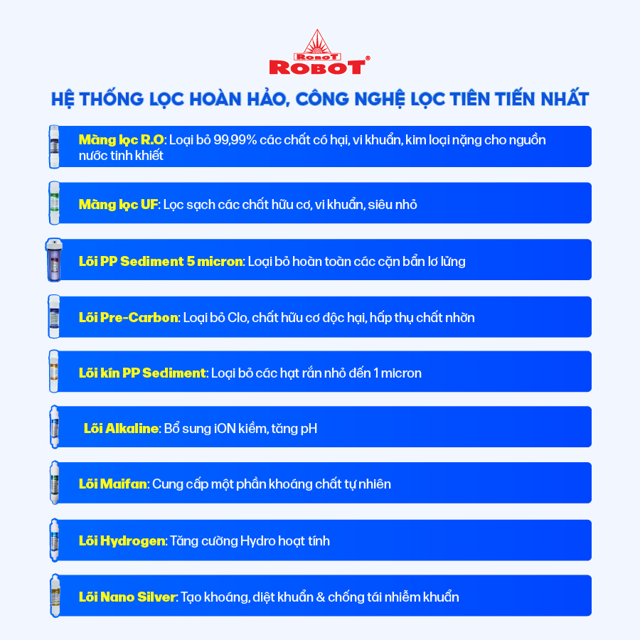 - Các sản phẩm máy lọc nước ROBOT đều sở hữu màn hình LCD sắc nét, hiển thị chi tiết các thông số TDS – chất lượng nước trước & sau lọc, tuổi thọ lõi lọc 24/24… để mọi người đều dễ dàng theo dõi hoạt động máy, chất lượng nước uống thông qua màn hình LCD, loại trừ mọi rủi ro, mang đến sự an toàn tuyệt đối khi sử dụng.