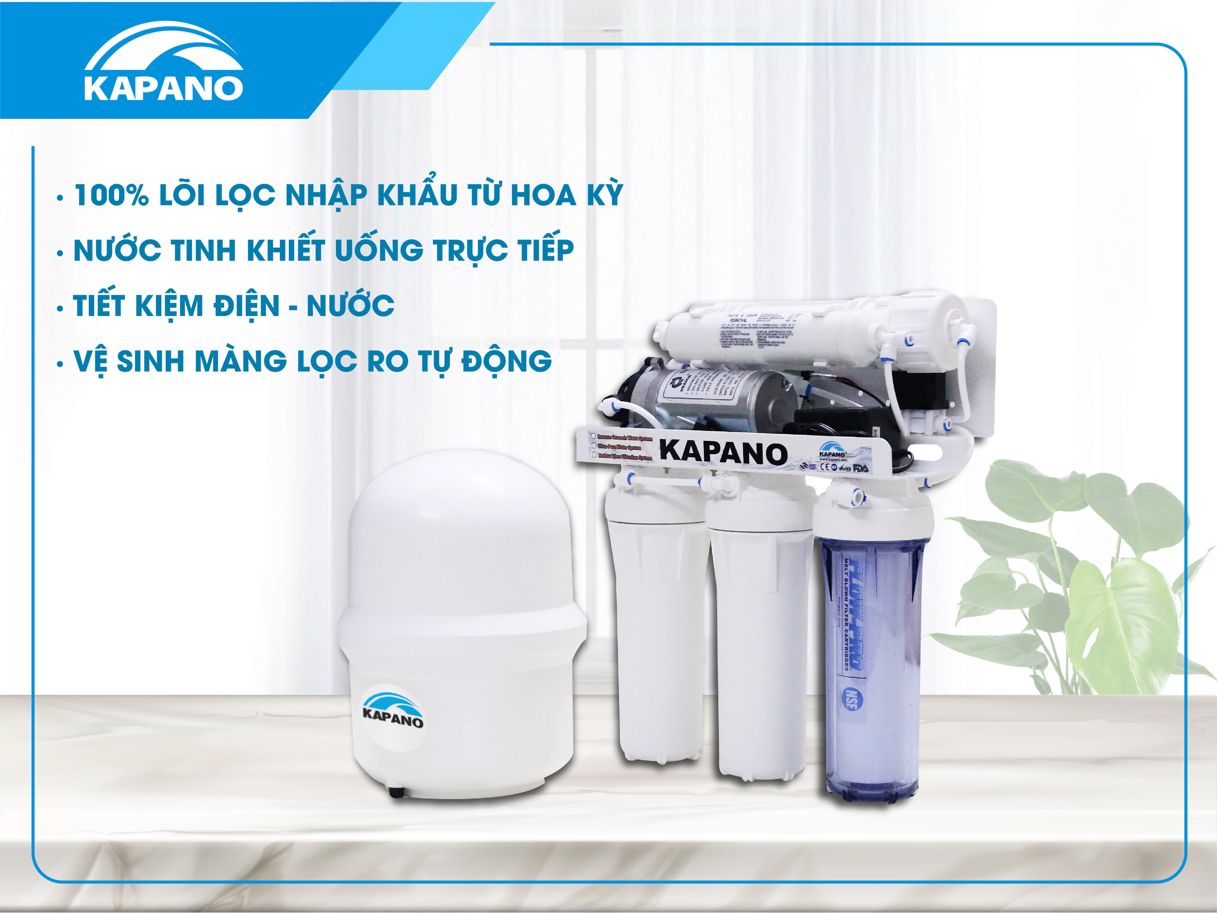 Máy lọc nước RO tủ kính cường lực Kapano RO5-USA-100B sử dụng 100% lõi lọc nhập khẩu từ Hoa Kỳ đạt tiêu chuẩn NSF FDA, có tủ kính cường lực thẩm mỹ cao.