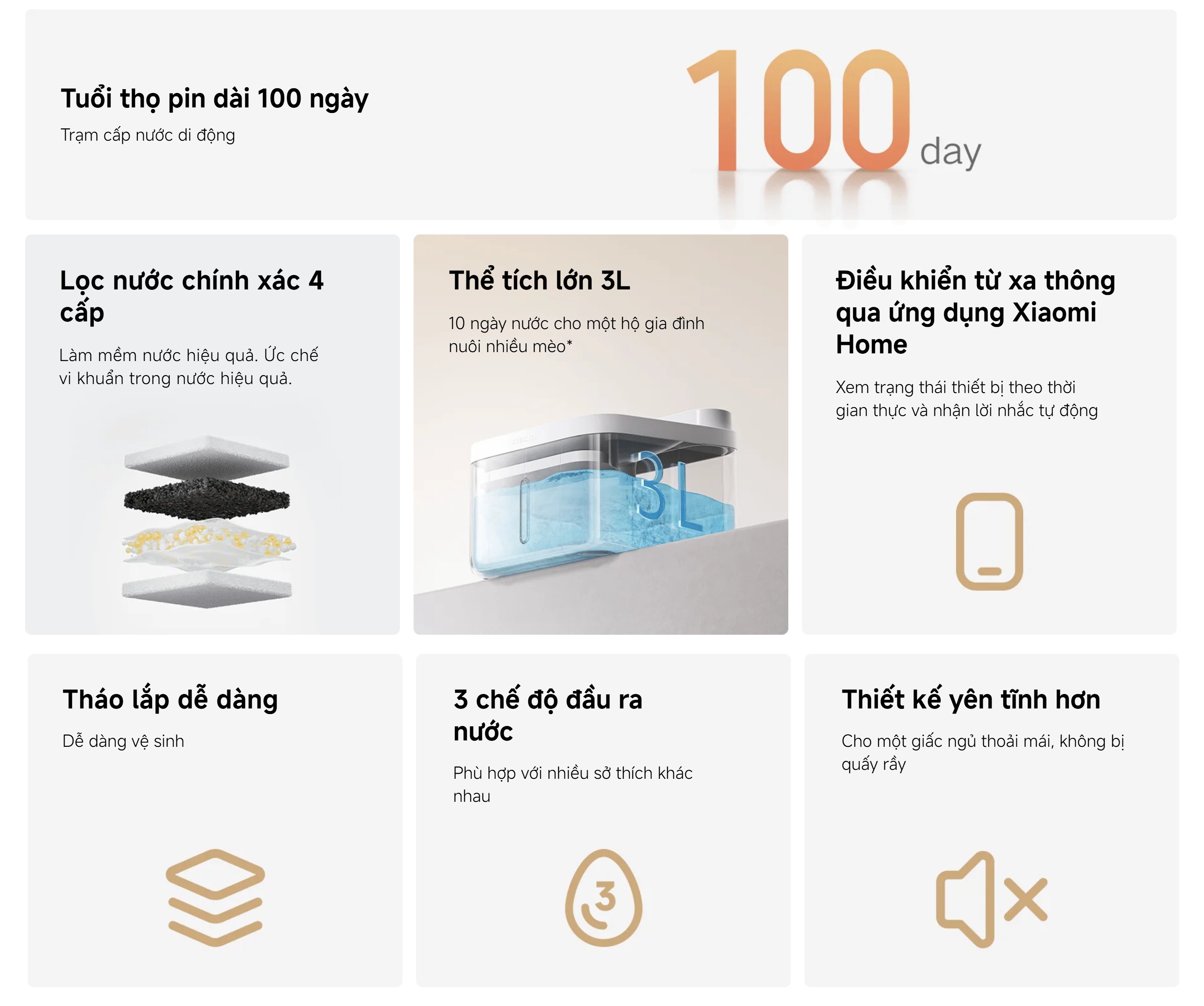 Dung tích lớn 3L Nạp lại một lần dùng trong 15 ngày Cung cấp đủ nước uống cho một con mèo trưởng thành trong 15 ngày hoặc một tuần cho những hộ gia đình nuôi nhiều mèo*, đảm bảo bạn an tâm khi vắng nhà trong thời gian ngắn. Thiết kế thông minh Dễ dàng tháo rời để vệ sinh thuận tiện Tháo rời trong vài bước đơn giản để vệ sinh hàng tuần dễ dàng. Xô góc tròn lớn với thành bên trong nhẵn giúp ngăn ngừa bụi bẩn tích tụ. Hoạt động êm ái Tận hưởng giấc ngủ yên bình Có thiết kế cung cấp nước không gây tiếng ồn, nước chảy dọc theo mép đài phun nước nên bạn có thể đặt trong phòng ngủ mà không lo tiếng ồn làm ảnh hưởng đến giấc ngủ của mình.