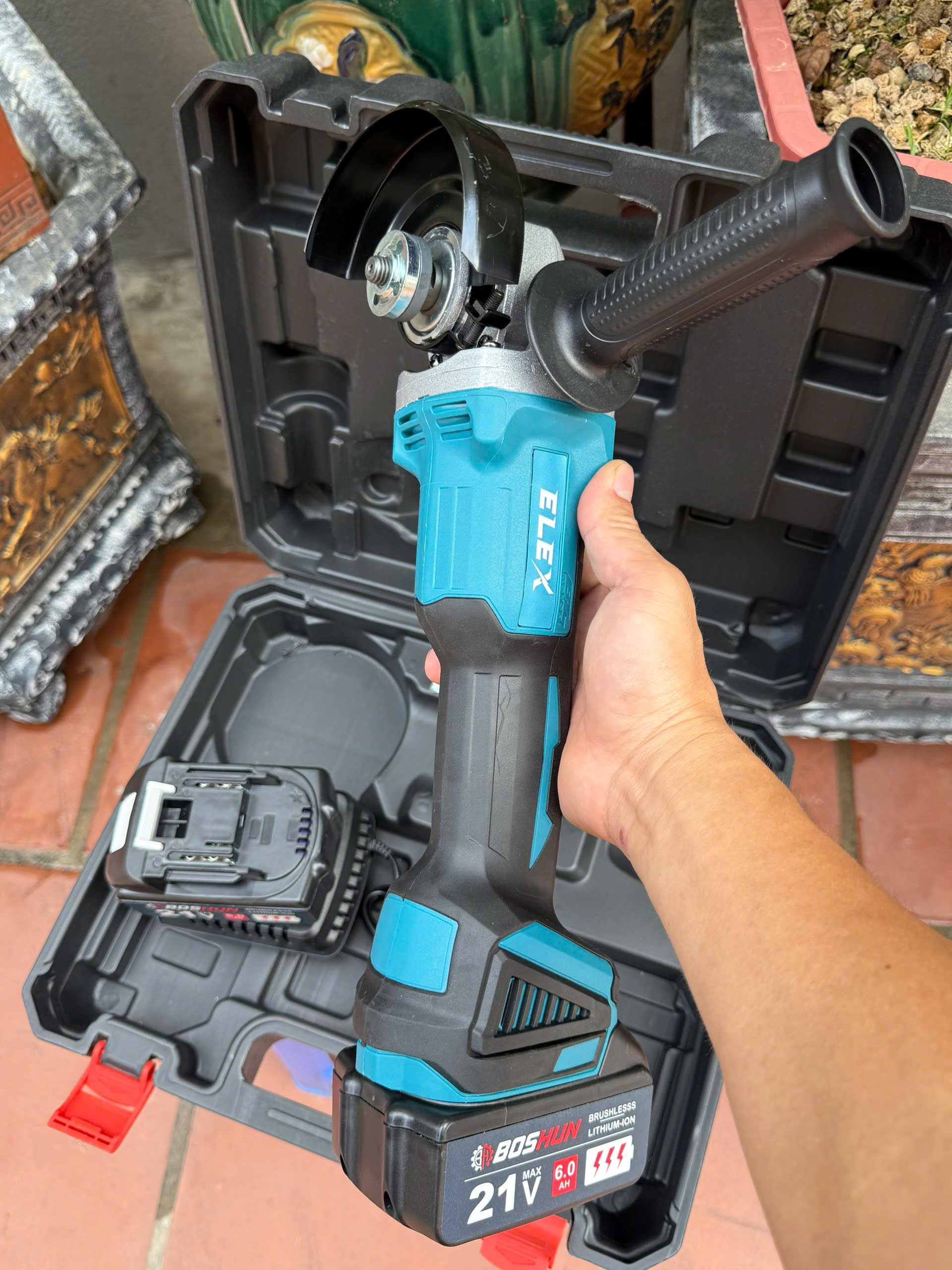 - Chức năng: mài góc, cắt sắt, cắt gỗ, cắt gạch,...trong gia đình hoặc công trình xây dựng. - Máy sử dụng động cơ không chổi than nên hoạt động mạnh, êm và tuổi thọ cao hơn các dòng máy có chổi than thông thường. - Ruột lõi đồng nguyên chất 100%, hoạt động mạnh và ổn định, không hỏng motor hay công tắc sau 1 thời gian như các dòng máy pha nhôm khác. - Thiết kế tay cầm chống trơn, dễ thao tác, thuận tiện cho người sử dụng. - Máy có tích hợp đèn báo pin, nút điều chỉnh tốc độ 3 cấp tốc độ sử dụng linh hoạt. - Pin 10 cell giúp máy hoạt động liên tục thời gian lâu. - Pin 10 cell có dòng xả cao giúp máy hoạt động liên tục mà không bị đứng máy hay mất nguồn khi đang THÔNG SỐ KỸ THUẬT CỦA MÁY: - Máy mài, máy cắt dùng pin không chổi than ELEX chuyên dùng để mài góc, cắt sắt, cắt gỗ, cắt gạch,...trong gia đình hoặc công trình xây dựng - Máy sử dụng động cơ không chổi than siêu bền + Ruột lõi đồng nguyên chất 100%, hoạt động mạnh và ổn định, không hư vặt ruột hay công tắc sau 1 thời gian như các dòng máy khác .- Dung lượng pin: 8000mAh- Đường kính đá mài/cắt tối đa: 100mm - Tốc độ không tải: 10.000 vòng/phút - Bộ sản phẩm kèm theo 2 pin Lithium-ion dung lượng cao (Pin 10 Cell) DÙNG PIN BOSHUN 199V - Điện thế sạc: 220V - 240V~50/60Hz- Có điều chỉnh tốc độ: 3 cấp tốc độ CHÍNH SÁCH BẢO HÀNH 6 THÁNG CHÍNH SÁCH CỦA CÔNG TY
