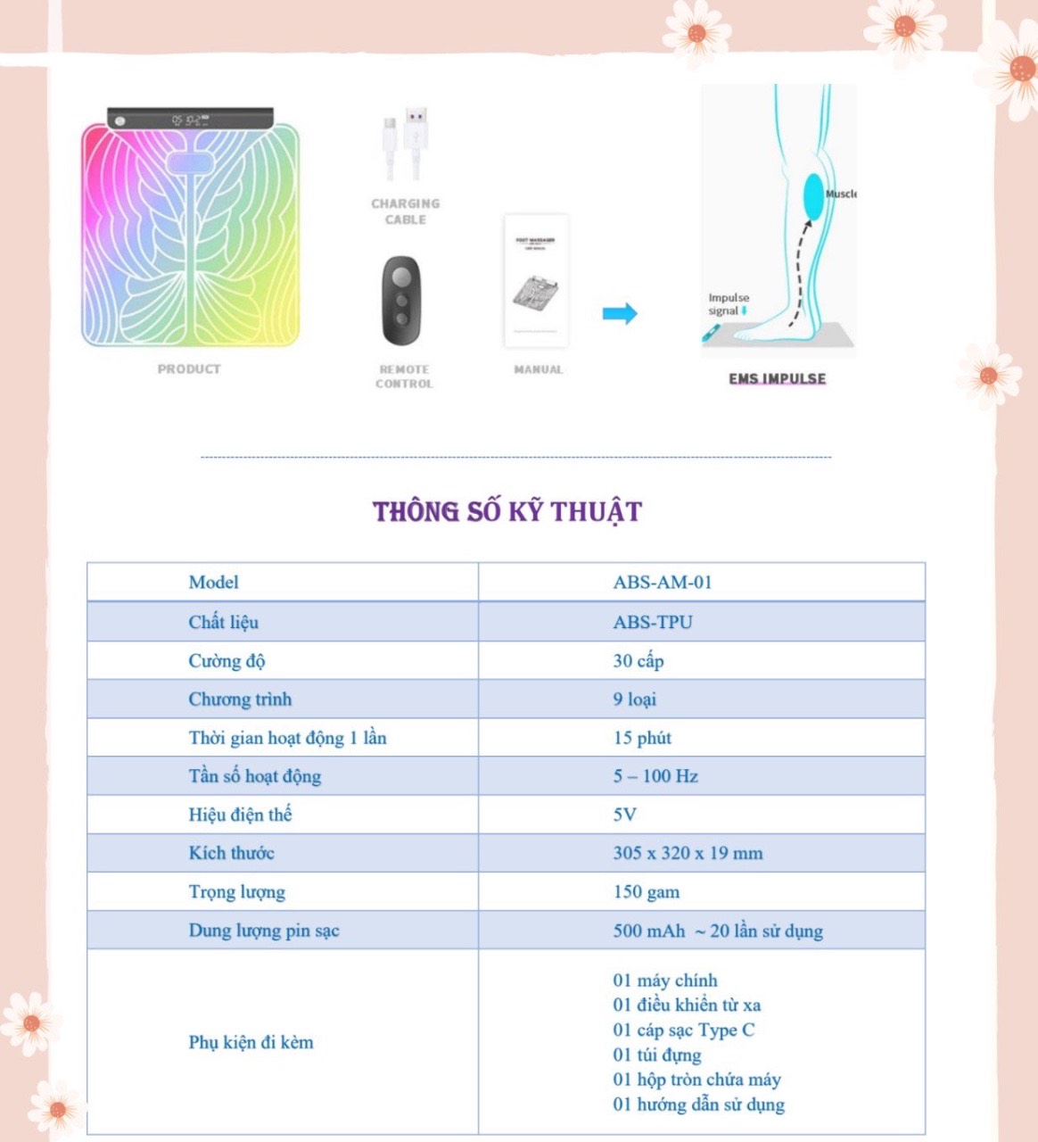 Cài đặt nhiệt độ mong muốn trong khoảng 35-48˚C, có 2 tiếng Bíp kêu khi nhiệt độ đạt được mức cài đặt. Có 8 đèn hồng ngoại tập trung ở dưới gan bàn chân. Có