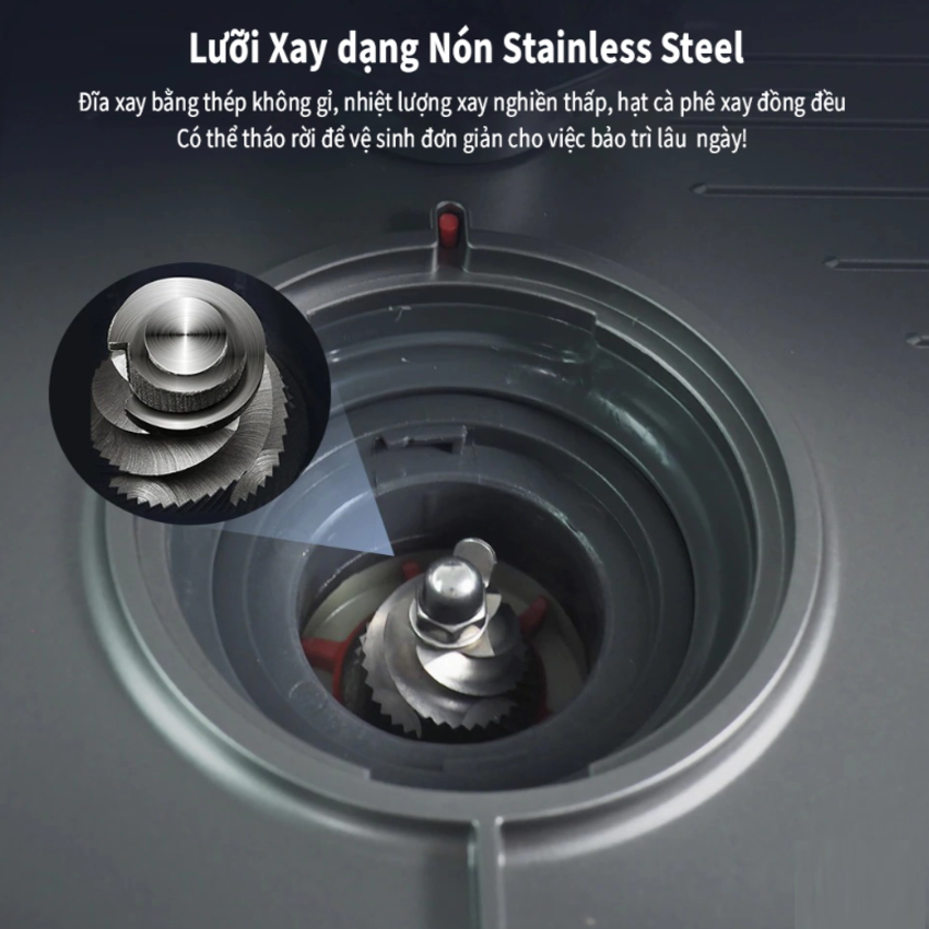- Lưỡi xay dạng nón stainless steel, xay bột cà phê siêu mịn