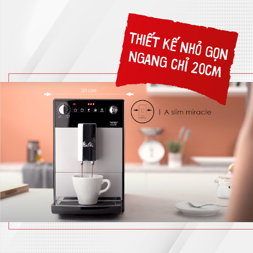 MÁY PHA CAFE TỰ ĐỘNG MELITTA PURISTA 300 PHIÊN BẢN ĐẶC BIỆT KỶ NIỆM 111 NĂM MELITTA Thưởng thức cà phê nguyên chất ngay tại nhà Purista thực sự rất mỏng – bề ngang chỉ 20 cm! Nhưng tất cả công nghệ Melitta chất lượng cao đều được gói gọn bên trong. Kích thước nhỏ gọn của máy giúp bạn dễ dàng đặt ở bất cứ nơi nào, dù là trong gian bếp hay văn phòng.   Xay chống ồn Bạn có thể uống cà phê mới xay ngay trong khi những người khác ngủ. Máy pha cà phê hoàn toàn tự động Avanza được tích hợp một máy xay hình nón bằng thép siêu yên tĩnh, giúp xay hạt cà phê một cách nhanh chóng và không ảnh hưởng đến những người xung quanh. Tính năng cà phê yêu thích Bạn biết bạn thích uống gì và muốn thưởng thức món yêu thích nhanh chóng? Chỉ cần chọn lựa khẩu vị, độ mạnh yếu cafe và tỉ lệ pha ưng ý, sau đó, bạn chỉ cần nhấn nút cà phê yêu thích. Mọi chuyện còn lại đã có Purista lo! Máy pha cà phê tự động sẽ giúp bạn làm những phần còn lại. Thiết kế nhỏ gọn Purista thực sự rất mỏng – bề ngang chỉ 20 cm! Nhưng tất cả công nghệ Melitta chất lượng cao đều được gói gọn bên trong. Kích thước nhỏ gọn của máy giúp bạn dễ dàng đặt ở bất cứ nơi nào, dù là trong gian bếp hay văn phòng đều vô cùng phù hợp. App Melitta Companion Ứng dụng miễn phí hỗ trợ bạn vận hành máy pha cà phê hoàn toàn tự động. Cho dù là hướng dẫn thực tế, thông tin thú vị về cách thưởng thức cà phê hay các chức năng dịch vụ tiện lợi: Chỉ cần tải xuống ứng dụng và khám phá vô vàn tính năng! Thưởng thức hương cà phê Sự điều khiển của máy bơm mới có thể tạo ra thời gian tiếp xúc lý tưởng cho nước và cà phê. Nhờ vào đó, bạn có thể thưởng thức hai loại cà phê espresso và cà phê crème cổ điển với hương thơm cà phê được phát triển tốt hơn. Hệ thống chiết xuất hương thơm Thêm hương thơm trước khi pha: cà phê mới xay được làm ẩm bằng nước trước quá trình pha thực sự. Điều này có nghĩa là các chất tạo hương vị hòa tan tốt hơn và sau đó chúng sẽ đi đến đâu? Tất nhiên là: trong cà phê. Độ đậm của cà phê có thể tùy chỉnh Một tách cafe thật đậm vào buổi sáng, nhưng lại chỉ muốn 1 tách nhẹ nhàng vào chiều tối? Giống như ý bạn muốn – cường độ của cà phê rất dễ điều chỉnh theo khẩu vị hiện tại của bạn từ nhẹ đến trung bình đến mạnh. Bạn có thể điều chỉnh lượng cà phê, thêm vào bớt ra chính xác theo cách của bạ Có thể điều chỉnh độ mịn với 5 cấp độ xay Cà phê theo cách bạn muốn – mới xay từ cafe nguyên hạt. Chế độ pha đồng thời 2 tách Sẽ vui hơn nếu cùng nhau thưởng thức và trò chuyện: Với Chế độ Double Cup, bạn có thể chuẩn bị hai tách cà phê espresso hoặc cà phê crème cùng một lúc. Vòi chiết xuất có thể điều chỉnh độ cao Vòi chiết xuất cafe có thể điều chỉnh chiều cao lên tới 135 mm để bạn cũng có thể sử dụng các loại ly có chiều cao lớn hơn mà không bị cản trở. Sứ mệnh chăm sóc hệ sinh thái Chúng tôi đã xây dựng một hệ thống giá trị riêng và phát triển một nhãn hàng trực tiếp giúp người dùng trong việc lựa chọn thiết bị đảm bảo ý thức với môi trường. Màn hình LED hiển thị biểu tượng  Chúng tôi chắc chắn rằng: màn hình LED với các biểu tượng màu đỏ giúp vận hành máy pha cà phê hoàn toàn tự động của bạn dễ dàng và thuận tiện. Chống trầy Với thiết kế mới này, khay nhỏ giọt được làm bằng thép không gỉ có tích hợp nhựa chống trầy xước cao cấp. Dễ dàng vệ sinh và bảo dưỡng Các bộ phận dễ dàng tháo rời và vệ sinh bằng nước, đảm bảo việc sử dụng cafe tốt nhất. Bộ phận máy bên trong cho phép vệ sinh dễ dàng bằng vải mềm. Chương trình làm sạch và tẩy cặn tự động Máy pha cà phê hoàn toàn tự động Melitta tự động thông báo cho bạn qua màn hình khi thiết bị cần được làm sạch, tẩy cặn hoặc bảo dưỡng. Thiết bị lọc nước Chúng tôi tin rằng bạn có thể nếm thử và cảm nhận: máy pha cà phê hoàn toàn tự động Melitta có thể được vận hành với bộ lọc nước Melitta Pro Aqua. Điều này có nghĩa là nước được lọc mới trước mỗi lần sử dụng. Hãy dùng thử và thưởng thức trọn vẹn hương vị không pha trộn của cafe. Bên cạnh đó, bộ lọc nước sẽ hỗ trợ máy của bạn trong việc bảo vệ máy pha cà phê chống lại sự vôi hóa. Nút dịch vụ hỗ trợ Các hoạt động không quá phức tạp? Rất nhiều! Nút dịch vụ giúp bạn dễ dàng truy cập vào chương trình làm sạch và tẩy cặn, cài đặt nhiệt độ pha và độ cứng của nước cũng như chức năng tự động tắt. Thay đổi bộ lọc cũng dễ như là trò chơi của trẻ con. Chức năng tiết kiệm năng lượng Máy pha cà phê Melitta Purista có chế độ tiết kiệm năng lượng có thể lập trình và chức năng tự động tắt tiện lợi. Điều này sẽ cho phép bạn xác định khi nào máy pha cà phê của bạn tự động tắt. Ngoài ra, bạn