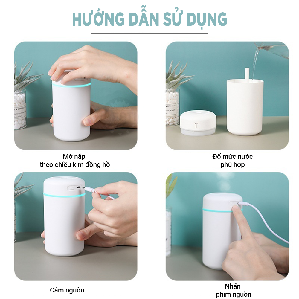 - An toàn: Tắt nguồn tự động khi hết nước III. HƯỚNG DẪN SỬ DỤNG Lấy que tăm bông ra và ấn vào nước, để hút nước đầy sau đó lắp lại. Thêm nước vào bình. (Nước tinh khiết) Cắm cáp usb và bật nguồn IV. BỘ SẢN PHẨM BAO GỒM