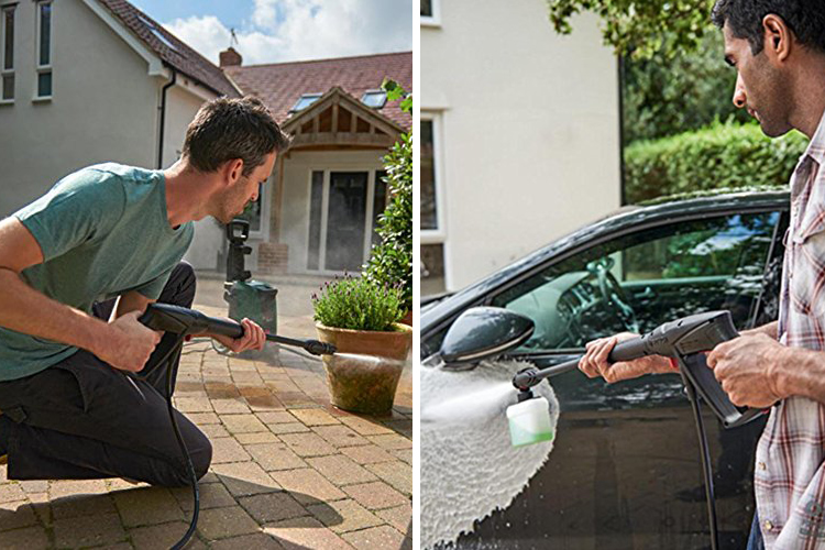 - Máy xịt rửa áp lực cao được thiết kế kiểu dáng bánh xe và tay cầm lật giúp dễ dàng di chuyển linh hoạt, có thể làm sạch ở mọi không gian của bạn. Không chỉ để rửa xe ô tô, xe máy bạn có thể rửa sân vườn, tưới cây, hồ bơi, ban công dễ dàng.