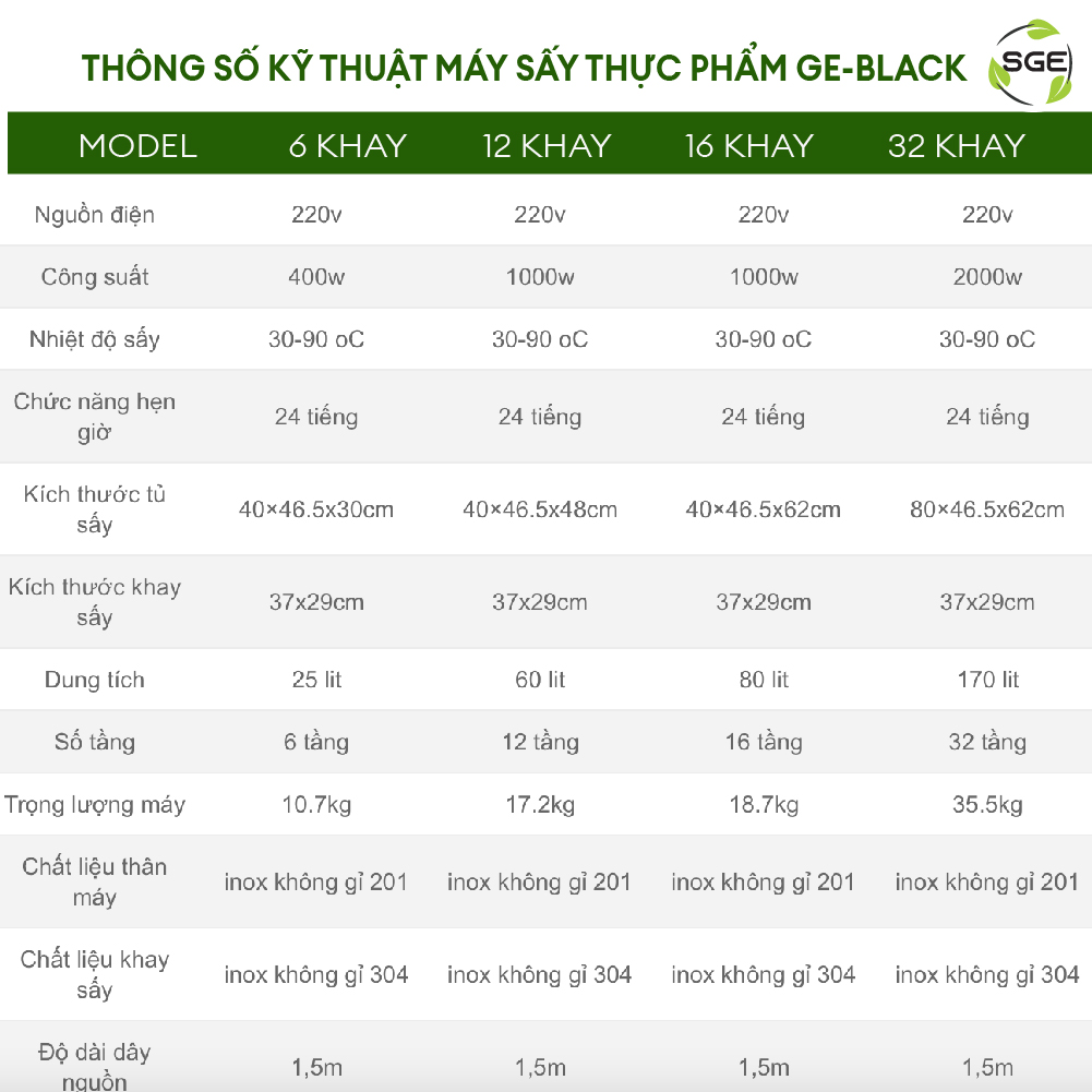 Tủ sấy thực phẩm GE-Black của SGE được thiết kế và phát triển liên tục. Phiên bản đặc biệt GE-Black dành cho hộ gia đình và nhà hàng hàng cao cấp với thân hình nhỏ gọn, tiết kiệm điện nhưng hiệu suất làm việc vẫn không đổi và có thể làm liên tục lên đến 24 giờ.