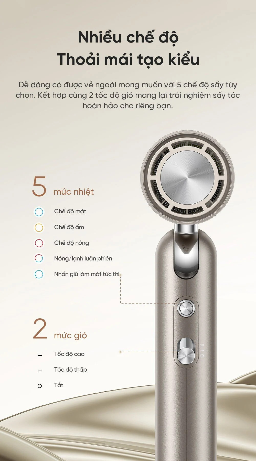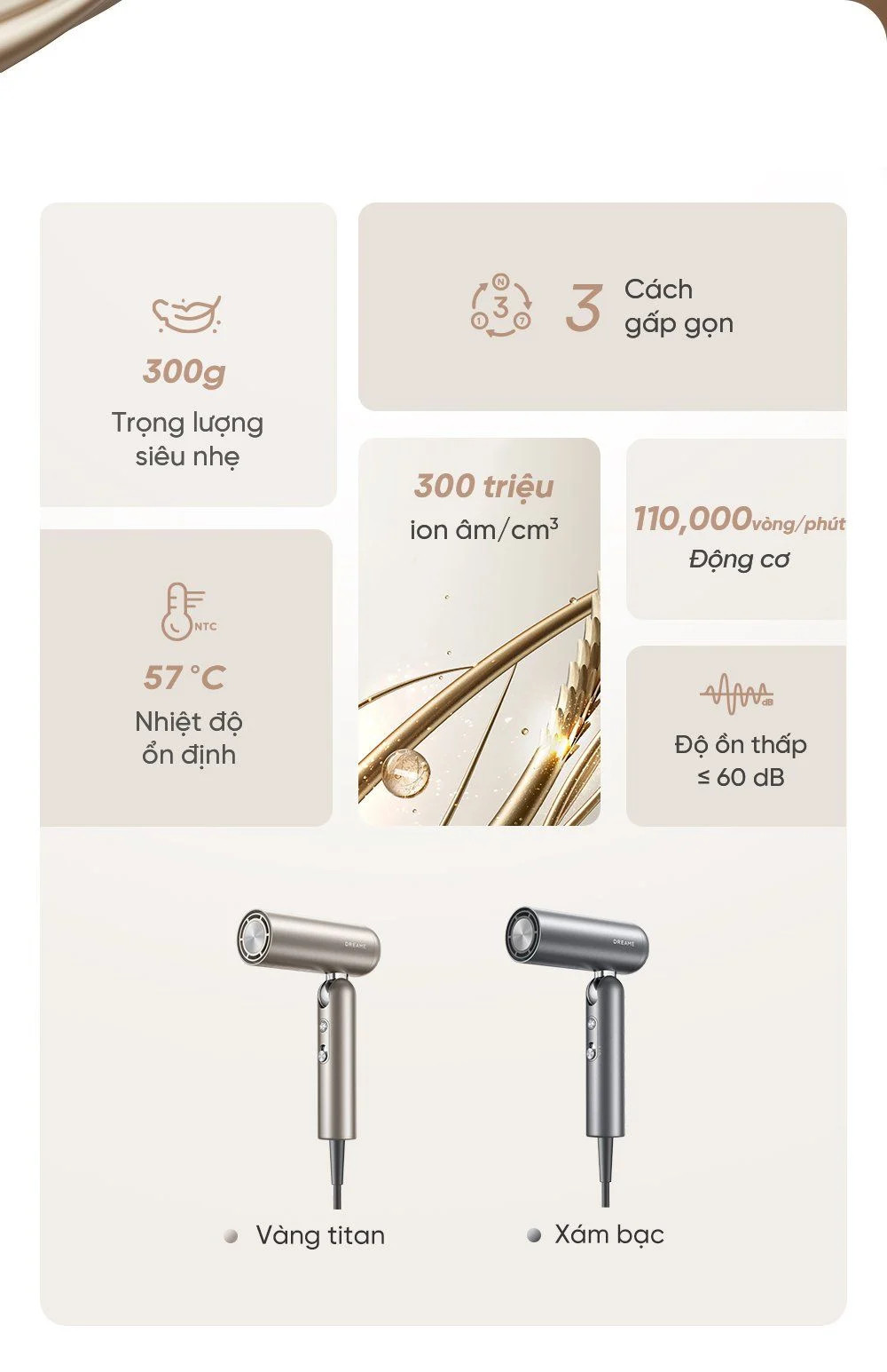 Động cơ không chổi than tốc độ cao 110.000 rpm, tốc độ gió 65m/s, làm khô tóc ngắn chỉ trong 40 giây Cảm biến kiểm soát nhiệt thông minh NTC, kiểm soát nhiệt độ 100