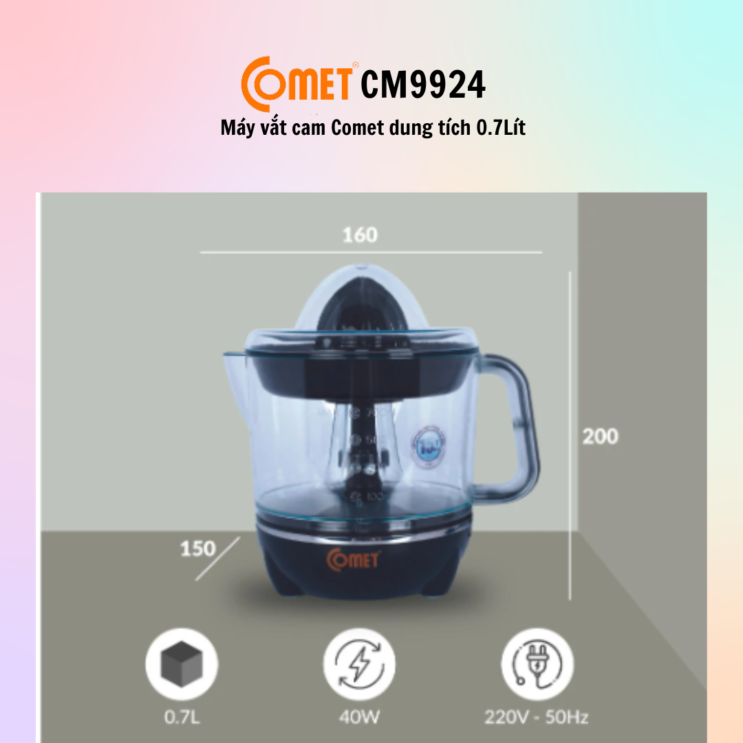 THÔNG TIN KỸ THUẬT: 1.Thương hiệu : Comet 2.Sản phẩm : Máy vắt cam 3.Mã sản phẩm : CM9929 4.Điện áp : 220V - 50Hz 5.Công suất: 40W 6.Dung tích: 1000ml 7.Kích thước : 185*150*208