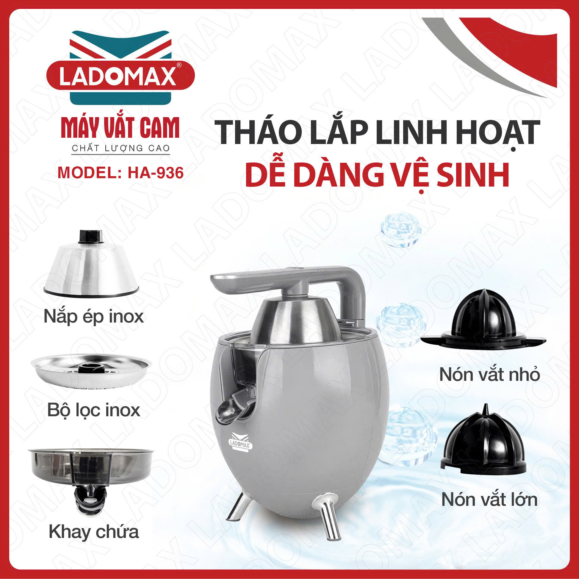 Thông tin sản phẩm Thương hiệu: Ladomax Máy: Máy vắt cam, vắt chanh Công suât: 860W Model :HA936 Núm: 2 đầu nấm lớn nhỏ Khay lọc: Inox Điện áp: 220-240V, 50/60HZ Bảo hành 12 tháng