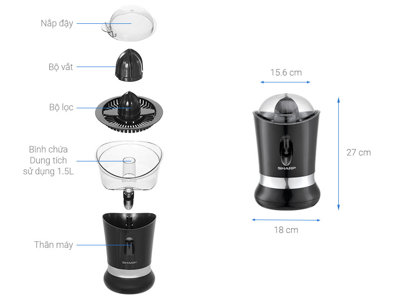 Thiết kế nhỏ gọn Máy vắt cam Sharp thiết kế gọn đẹp, kiểu dáng sang trọng, dùng đẹp cho không gian gia đình, quán nướ Máy dễ sử dụng với 1 tốc độ vắt, chỉ
