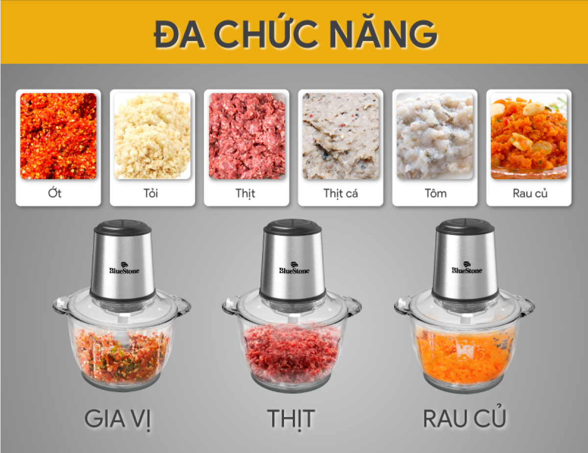 - Đa chức năng xay Máy xay thịt BlueStone CHB-5145 có khả năng xay nhiều loại thực phẩm từ thịt, thịt cá, rau củ và cả các loại hạt và gia vị như tỏi, ớt, hà Đây là một thiết bị không thể thiếu trong căn bếp, giúp tạo ra các món ăn tươi ngon và an toàn.