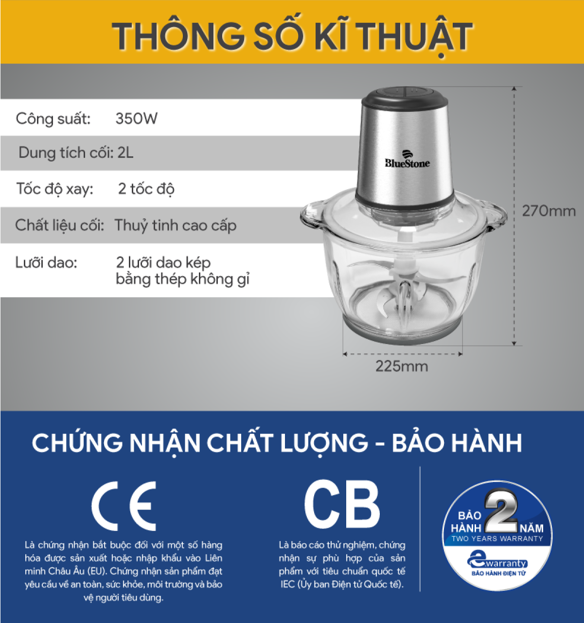 - Thông số kỹ thuật máy xay thịt BlueStone CHB-5145 Công suất: 350W Tốc độ xay: 2 tốc độ Dung tích cối: 2 lít Chất liệu cối: Thủy tinh cao cấp Lưỡi dao: 2 lưỡi dao kép bằng thép không gỉ