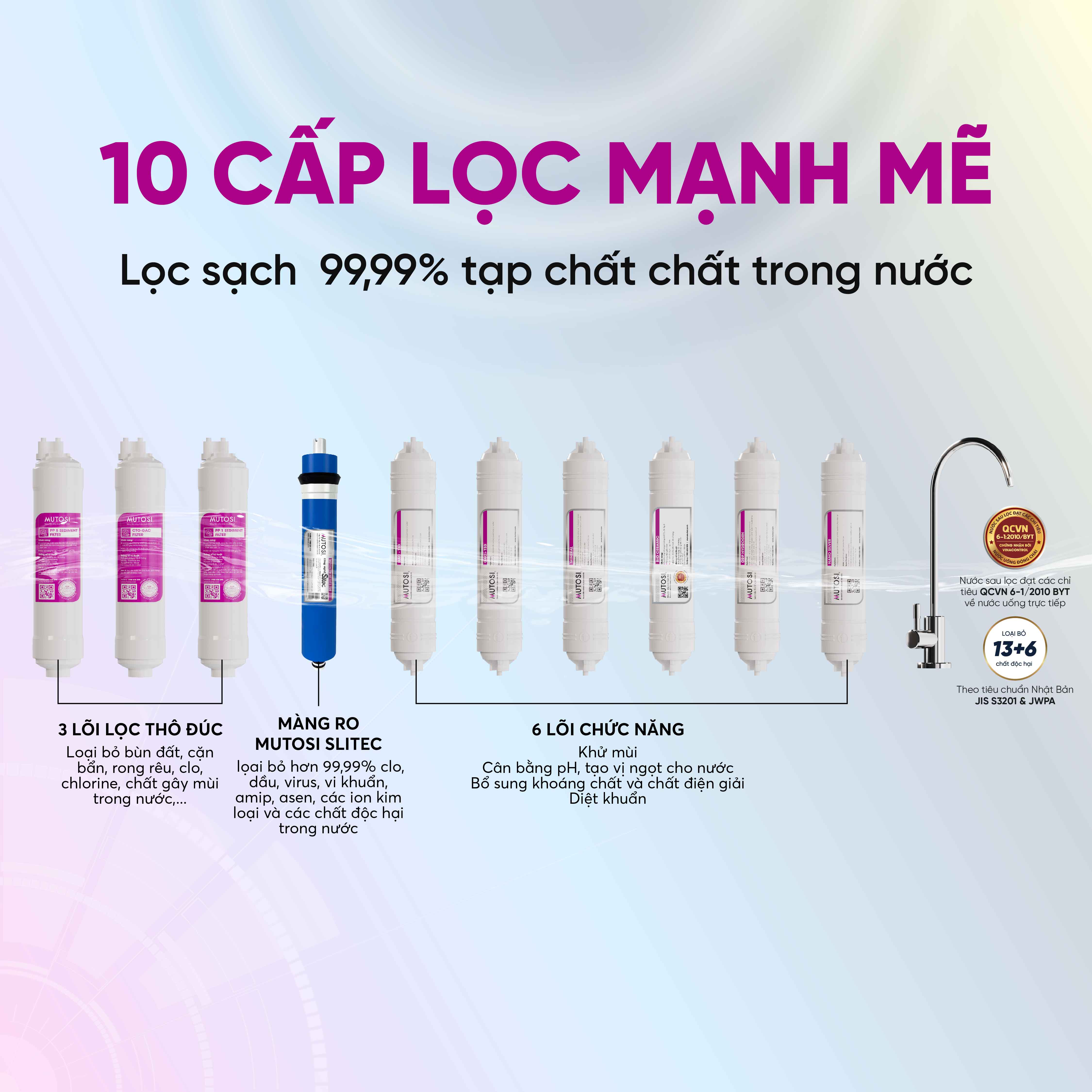 -Hệ thống 10 lõi lọc bổ sung khoáng chất, trong đó lõi hydrogen hỗ trợ tăng cường miễn dịch và ngăn ngừa lão hóa hiệu quả (trong khi các dòng máy để gầm khác thường chỉ có 7-8 lõi lọc, thiếu lõi chức năng bổ sung khoáng và không có lõi hydrogen)