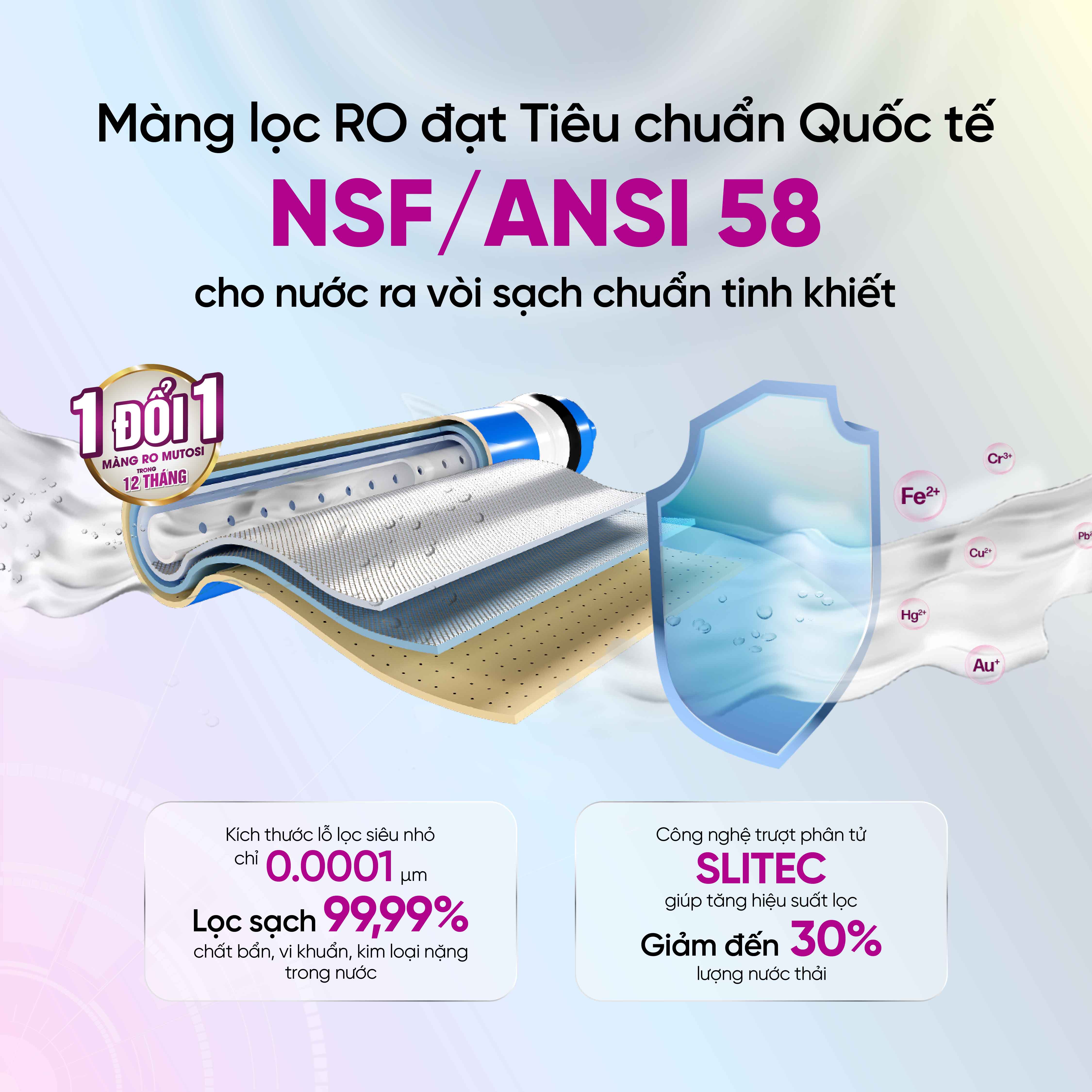 -Lọc sạch hơn nhờ màng lọc RO Mutosi Slitec đạt chứng nhận toàn cầu NSF/ANSI58 - tiêu chuẩn cao nhất cấp cho màng RO bởi tổ chức NSF (tổ chức hợp tác về an toàn thực phẩm và nước uống trực thuộc WHO), đồng thời được công bố chính thức trên website của NSF