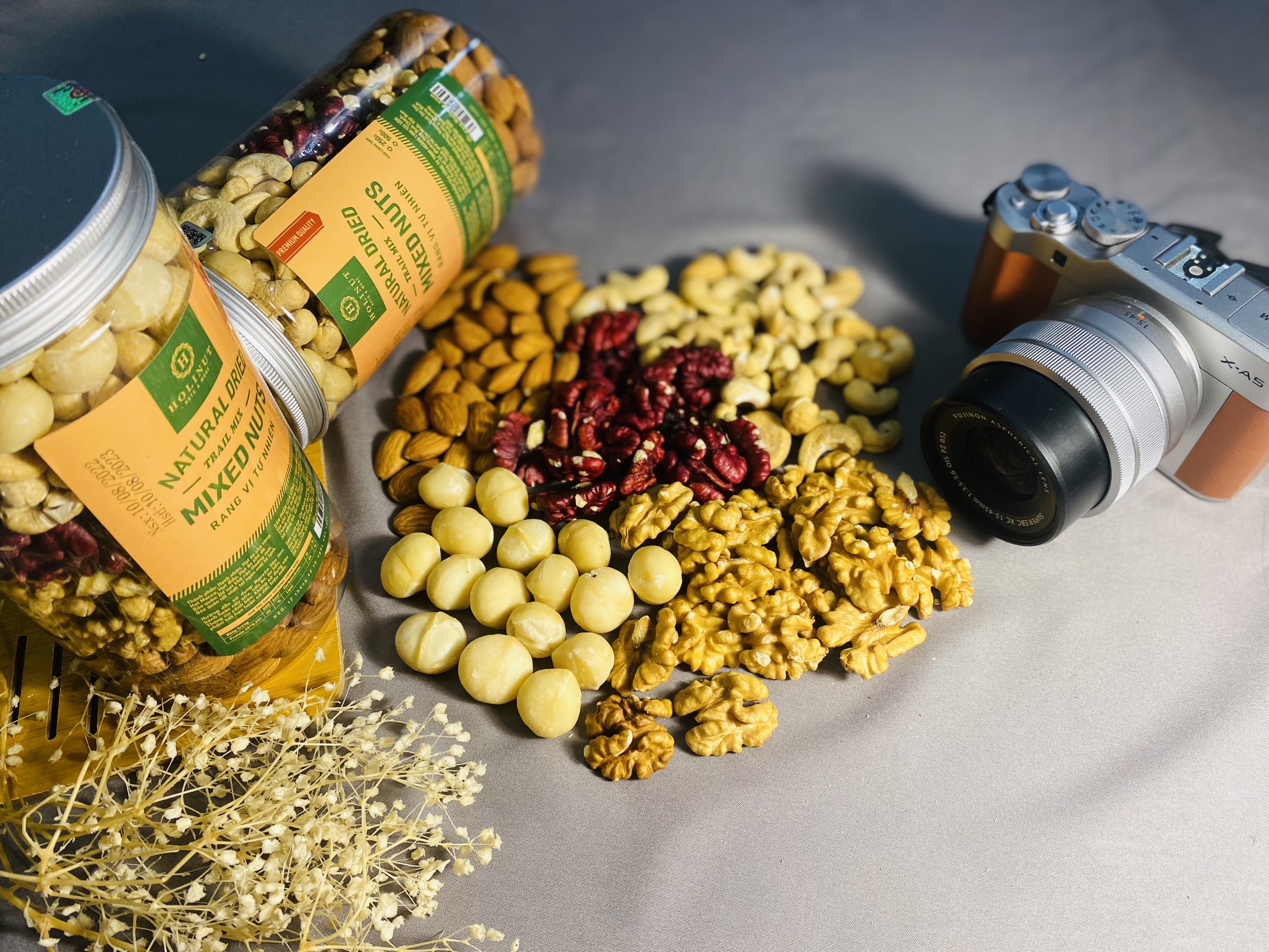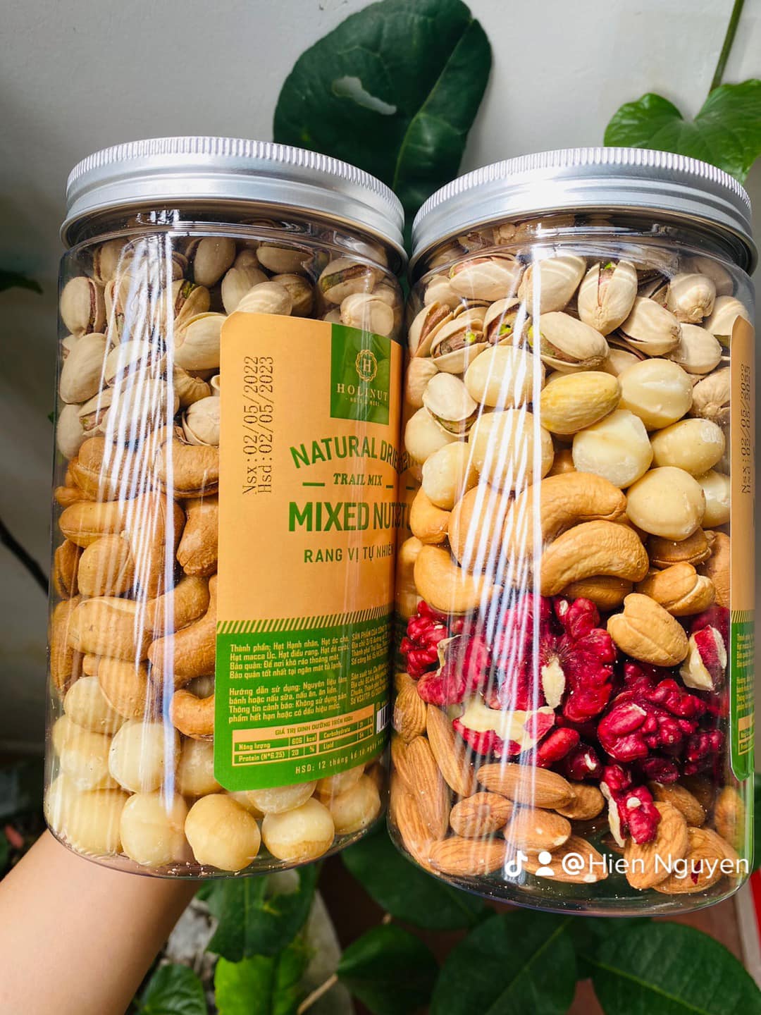Mix hạt cao cấp được chọn lọc 5 loại hạt dinh dưỡng tại Holinut Thành phần: Nhân óc chó vàng, nhân óc chó đỏ, nhân macca, hạt hạnh nhân, hạt điều. Quy cách: hũ/500gram Thành phần dinh dưỡng của 5 loại hạt mix: Hạt mắc ca: Trong hạt mắc ca chứa 78,2% chất béo, 10% đường, 9,2% chất đạm. Các khoáng chất nhân mắc ca như kali 0,37%, photpho 0,17%, Mg 0,12%. Trong nhân mắc ca không chỉ là hàm lượng chất béo, chất xơ vị ngọt mà còn có mùi thơm của sữa bò kích thích khẩu vị của người ăn. Hạt óc chó: Là loại hạt dinh dưỡng rất giàu Omega 3, chất xơ, protein, canxi…Theo một số nghiên cứu khoa học thì hàm lượng Omega 3 có trong hạt óc chó cao gấp 3 lần cá hồi. Hạt điều: Trong hạt điều chứa nhiều hàm lượng chất dinh dưỡng cần thiết cho cơ thể như vitamin( E,K và B6), khoáng chất( đồng, kẽm, magie, sắt, selen…), chất chống oxy hóa. Hạt hạnh nhân: Trong hạt hạnh nhân có nhiều axit phytic, một lượng đồng , vitamin B2, phopho…Bên canh đó axit phytic được coi là chất chống oxy hóa hiệu quả và lành mạnh. Công dụng của 5 loại hạt mix điều dinh dưỡng: