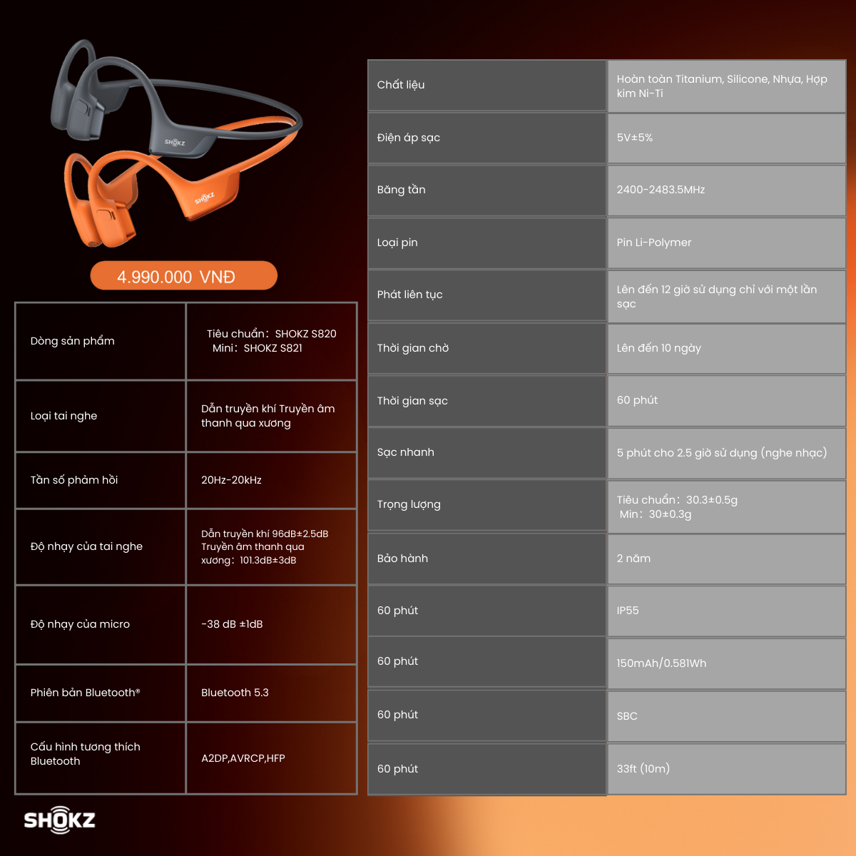 Chip: JL 7003F Kết nối Bluetooth: V5.3 Dung lượng Pin: 300mAh Thời gian chơi nhạc 26h, Gọi điện thoại 7h, thời gian chờ 30h, thời gian sạc 2h Hỗ trợ nhạc bluetooth / Aux Kích