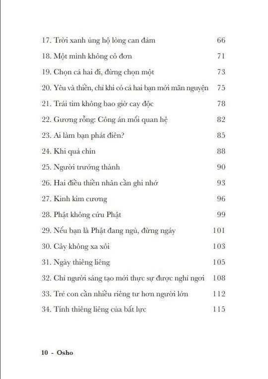 Một Muỗng Thiền “Con người được sinh ra không chỉ như một giống loài bám đất, làm những công việc mưu sinh tích cóp vật chất duy trì sự sống qua ngày; nhưng con người còn được sinh ra với “đôi cánh lớn”, giúp họ mở rộng những tiềm năng, để soải cánh bay vào vùng trời tối thượng, khám phá những chân trời và những bình diện mới của sự tồn tại. Để biết m.ình là ai và sự hiện hữu của m.ình có ý nghĩa gì.” Osho Chiêm tinh, một môn huyền học của Phương Đông, đã từng dự đoán ngày 20/12/2012 là ngày tận thế của thế giới. Thực ra, đó chỉ là cách tính của người Maya trong việc trái đất hoàn thành những vòng quay cuối của kỷ nguyên Song Ngư để tiến vào thời đại Bảo Bình - theo Chiêm tinh học Phương Đông. Bảo Bình - Thời đại mới, được dự đoán là thời kì “vàng son” của nhân loại, khi những đặc tính của niềm vui sáng tạo, chân lý, tính cá nhân và sự chia sẻ đại đồng lên ngôi, thay cho những đặc tính của kỷ nguyên Song Ngư là sự khuôn mẫu, tập tính đám đông, tư duy đề cao vật chất và sự sở hữu. Osho - đạo sư, nhà huyền môn gây nhiều tranh cãi nhất trong thế kỷ 21, có lẽ là đại diện số một cho sự khác biệt mang tính thời đại giữa hai kỷ nguyên này. Lời dạy của Osho tạo ra rất nhiều tác động tích cực cũng như gây nhiều tranh cãi khắp thế giới. Lý do chúng gây tranh cãi, một phần là do chúng ta quên. Chúng ta quên rằng bối cảnh những bài nói của Osho thời điểm ấy, phần nhiều được dành cụ thể và đích danh cho Ấn Độ - vùng đất có rất nhiều những mê tín dị đoan và những niềm tin có phần “kì dị”. Trong một bối cảnh xã hội với hàng ngàn đức tin tranh đấu, đôi khi người ta phải trở nên cực đoan nếu muốn đem thông điệp của m.ình đến với mọi người. Chưa kể với tốc độ phát triển của công nghệ ngày nay, chỉ một vài năm khoảng cách cũng đủ để đã tạo ra những khác biệt mang tính thời đại, thì những bài nói của Osho có thể coi như là dành riêng cho một dân tộc khác, ở một thời đại khác. Việc đem hết các lời dạy của ông để so sánh với thời đại này và dân tộc hiện tại này của chúng ta, đã là một sự chủ quan có phần không chuẩn xác. Vì để so sánh, việc hai đối thể ở trên cùng bình diện là điều rất cần thiết. Bởi lẽ đó, nếu như bạn đọc có thể đọc Osho và đồng thời xét nó trên bình diện của một dân tộc Ấn Độ đầy rẫy những ước đoán, định kiến, nơi những niềm tin có phần mê tín đã chi phối cuộc sống của người dân trong thời gian rất dài, thì lời của Osho sẽ không quá “phản” lễ giáo-phong tục như người ta vẫn thường lên án. Việc thấu hiểu bối cảnh này không chỉ giúp mang lại cho chúng ta một khả năng quan sát lớn lao mà còn là khả năng nhận định và suy xét những lời dạy nào là thích hợp và cần thiết với bản thân mỗi người trong quá trình học hỏi và tìm tòi “ánh sáng”. Bởi lẽ tuy văn hoá và niềm tin của mỗi dân tộc, mỗi tôn giáo là khác nhau nhưng bản chất về sự hiện sinh của con người qua bao thời đại cũng không quá nhiều thay đổi. Những người không hứng thú với việc truy tìm “ánh sáng” thì vẫn cứ dò dẫm trong bóng tối của vô nhận biết, vô minh. Nhưng những người bắt đầu đặt chân vào hành trình truy tìm đúng sai thì đã một tay thắp lên ngọn đèn của riêng m.ình. Việc tự thân đọc và ngẫm những lời dạy của Osho là rất quan trọng. Quan trọng hơn nữa là việc đem chúng vào ứng dụng trong đời sống để biết điều gì là thích hợp và đáng học hỏi, điều gì là chưa thích hợp, không đúng thời điểm hoặc thậm chí có thể sai. Biết cái gì đúng, cái gì sai ấy là khởi đầu của việc biết sự thật, biết chân lý. “Và chân lý sẽ giải phóng ngươi”, câu nói trong Kinh Thánh có nghĩa là, bất cứ lời dạy nào của ai và của thời đại nào, nếu bạn ứng dụng lời ấy vào cuộc sống và nó làm biến đổi cuộc đời bạn, nó “giải phóng” bạn, ấy thì lời đó chính là chân lý. Chúng ta không biết cái gì là chân lý, cho tới khi chứng nghiệm được sự giải thoát của riêng m.ình. Osho không viết sách, ông chỉ thuyết giảng và đã thuyết giảng liên tục trong ba mươi năm ròng. Những bài giảng của ông được thâu băng, bóc băng và in thành sách cùng với việc chuyển ngữ sang nhiều thứ tiếng. Osho không chỉ là một thiền nhân, một nhà huyền môn mà còn là một triết gia, một học giả, một nghệ sĩ thích “chơi” với ngôn từ. Vì vậy, những lời giảng của ông vừa đậm tính triết lý lẫn tính thơ và tất nhiên không thể không kể đến tính thiền – tính khai phóng tư tưởng. Ông là một trong số những người đã cố gắng “dùng ngôn từ” để đưa độc giả vượt lên trên và đi ra khỏi những giới hạn của ngôn từ. Sách Osho đã được dịch sang nhiều thứ tiếng và được biên tập thành nhiều chủ đề chuyên biệt. Mặc dù đã cố gắn