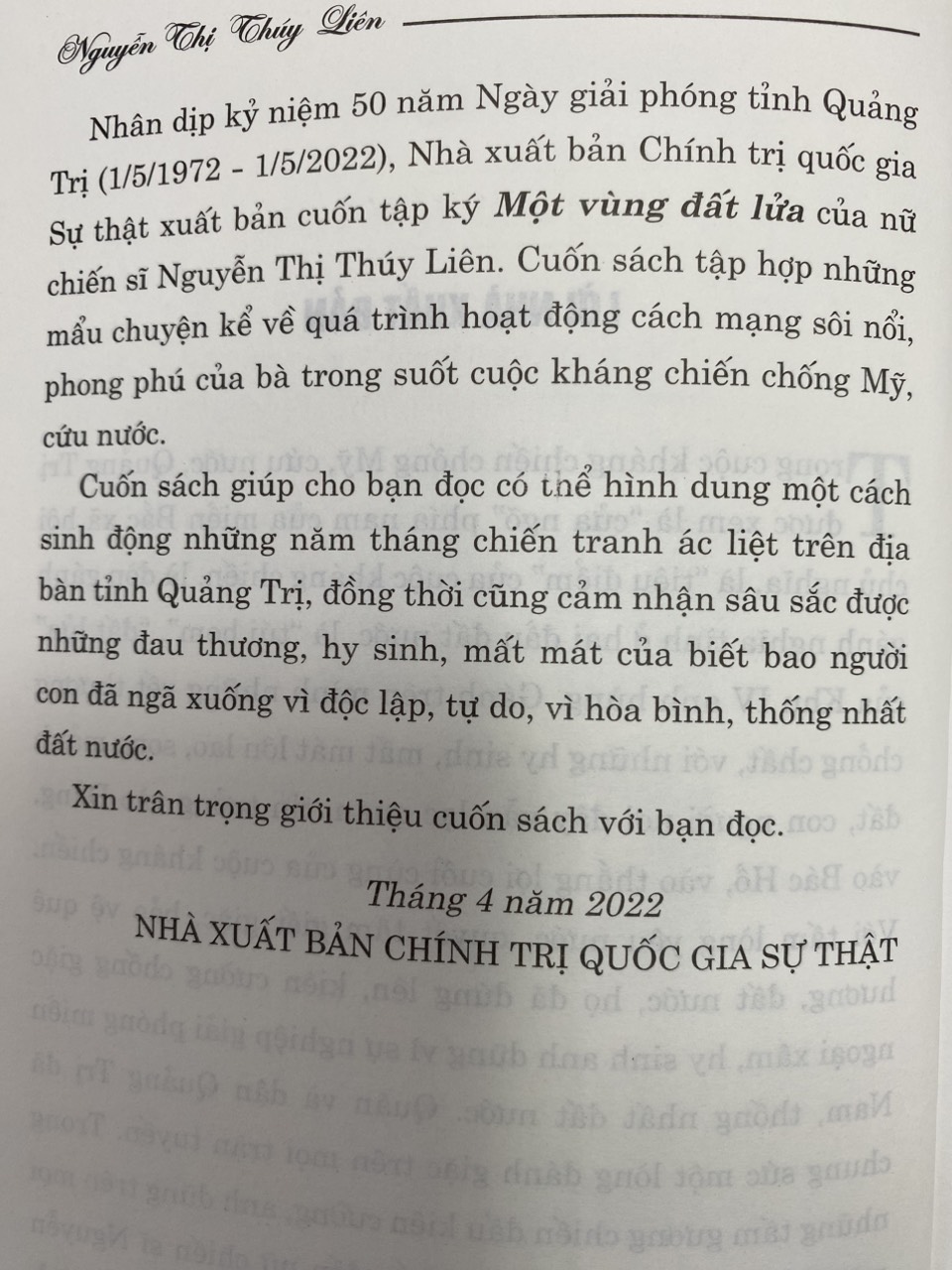 Mua tại TiktokCuốn sách tập hợp những mẩu chuyện kể về quá trình hoạt động cách mạng sôi nổi, phong phú của nữ chiến sĩ Nguyễn Thị Thúy Liên – người con Quảng Trị, người cán bộ binh địch vận xuất sắc đã có nhiều cống hiến trong sự nghiệp kháng chiến chống Mỹ, cứu nước vĩ đại của dân tộc. Nội dung cuốn sách giúp cho bạn đọc có thể hình dung một cách sinh động những năm tháng chiến tranh ác liệt trên địa bàn tỉnh Quảng Trị, đồng thời cũng cảm nhận sâu sắc được những đau thương, hy sinh, mất mát của biết bao người con đã ngã xuống vì độc lập, tự do, vì hòa bình, thống nhất đất nước.