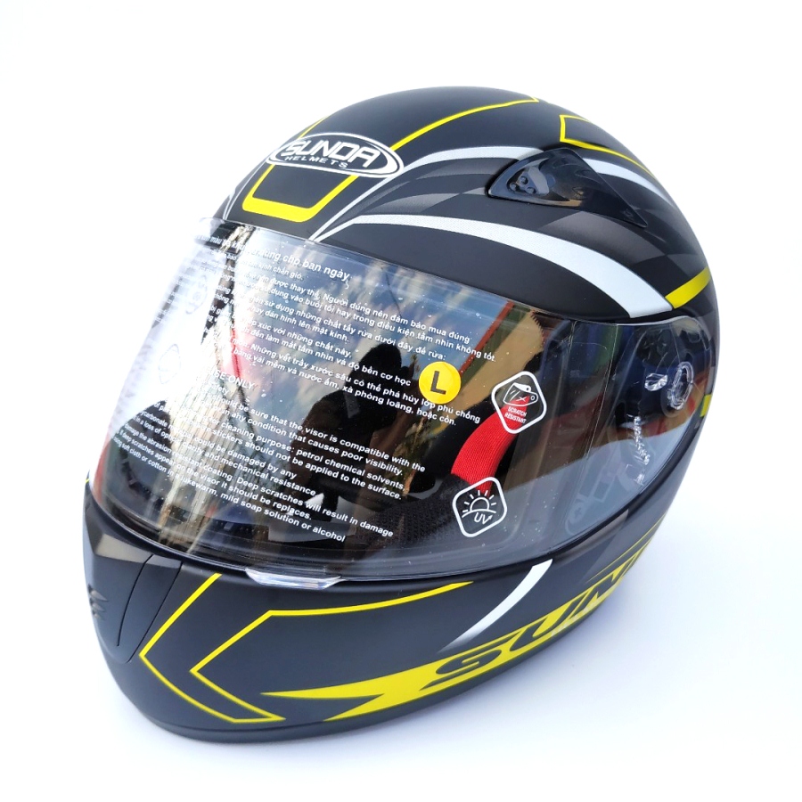 Mũ bảo hiểm fullface chính hãng Sunda 2000c đen nhám tem vàng là sản phẩm được cải tiến từ mẫu Andes/Sunda 2000A vốn được sản xuất để xuất khẩu phục vụ chủ yếu cho thị trường nước ngoài, nơi thường có form đầu lớn hơn người Việt Nam. Sunda 2000c được thiết kế đơn giản hơn, tinh giảm bớt 1 lỗ thông gió ở chính giữa của mũ, nhưng vẫn giữ 2 lỗ thông gió lớn 2 bên. Các lỗ thông gió bên trong lớp xốp để dẫn gió vào bên trong mũ được bố trí hợp lý xung quanh đầu đảm bảo người sử dụng luôn cảm thấy thoải mái nhất khi sử dụng kể cả khi phải di chuyển trong một thời gian dài. Nón được thiết kế nhỏ gọn hơn, lòng nón sâu, phù hợp với cỡ đầu phổ biến của người Việt Nam trưởng thành (Mũ chỉ có 1 size duy nhất). Nón cũng có màu sắc trang nhã hơn so với phiên bản gốc dành cho thị trường nước ngoài. Sunda 2000c là sản phẩm có độ bền cao, chịu được va đập tốt, thiết kế thời trang thông minh, bảo vệ an toàn trên mỗi hành trình của bạn. Sản phẩm giúp triệt tiêu ngoại lực tác động bên ngoài vào mũ, hạn chế tối đa tổn thương đến đầu khi có va chạm mạnh xảy ra. Mũ được thiết kế cho người đam mê tốc độ, có kính chắn gió rất tiện lợi và an toàn cho người đội. Kính được làm từ vật liệu chất lượng cao, đã qua xử lý đặc biệt, cho góc quan sát rộng, hình ảnh rõ nét, trung thực, không bị chói đèn, có khả năng chống tia UV, chắn gió, để bạn tập trung lái xe. Mũ bảo hiểm fullface Sunda 2000C tem với vỏ mũ được sản xuất từ chất liệu nhựa ABS có tính năng chịu va đập mạnh, lớp xốp bên trong mũ dày, vừa vặn bám chặt với phần vỏ giúp triệt tiêu hoàn toàn xung lực mạnh từ bên ngoài tác động vào, giảm chấn hiệu quả tối đa, ôm trọn vòng đầu. Do đó, bảo vệ tốt và giảm tối đa các chấn thương đầu khi không may xảy ra va chạm. Trọng lượng được phân tán đều, không gây cảm giác nặng và đau đầu, tạo cho người đội cảm giác thoải mái khi sử dụng. Phần xốp phía trong mũ dày làm bằng EPS 100% chính phẩm và được bọc bởi một lớp đệm êm, có khả năng hấp thu xung lực cao. Mũ sử dụng lớp vải lót kháng khuẩn, có khả năng thấm hút cao, giúp thoáng khí tốt, không gây ra các bệnh về da đầu và tóc. Ngoài ra, mũ còn được trang bị khóa inox chắc chắn và dây quai chịu lực cực mạnh, độ dài linh động phù hợp với nhiều người. Lớp lót mũ được thiết kế để có thể tháo lắp dễ dàng, nhanh chóng. Bạn có thể dễ dàng tháo rời lớp lót ra để giặt hoặc vệ sinh. Mũ thiết kế nhiều lỗ thông gió phía trước và sau mũ, các lỗ này có thể đóng mở được, đảm bảo bạn luôn cảm thấy thoải mái và dễ chịu khi sử dụng. Mũ có kiểu dáng thời trang cùng màu sắc tinh tế, trang nhã, thể hiện phong cách thời trang cá tính của bạn. Mũ phù hợp cho người có vòng đầu từ 55-59 cm - tương đương size L, thích hợp với người có vòng đầu trung bình.   Hướng dẫn xác định cỡ mũ phù hợp: Vòng 1 sợi dây quanh đầu, phía trên lông mày và tai khoảng 2cm. Xiết sợi dây sao cho ôm vừa đủ thoải mái lấy đầu và ghi lại số đo đó. Lặp lại như vậy để tìm được số đo mà bạn thấy đầu dễ chịu nhất. Đó chính là size đầu của bạn. So sánh với kích cỡ mũ để lựa chọn size mũ phù hợp. Thông tin về thương hiệu: