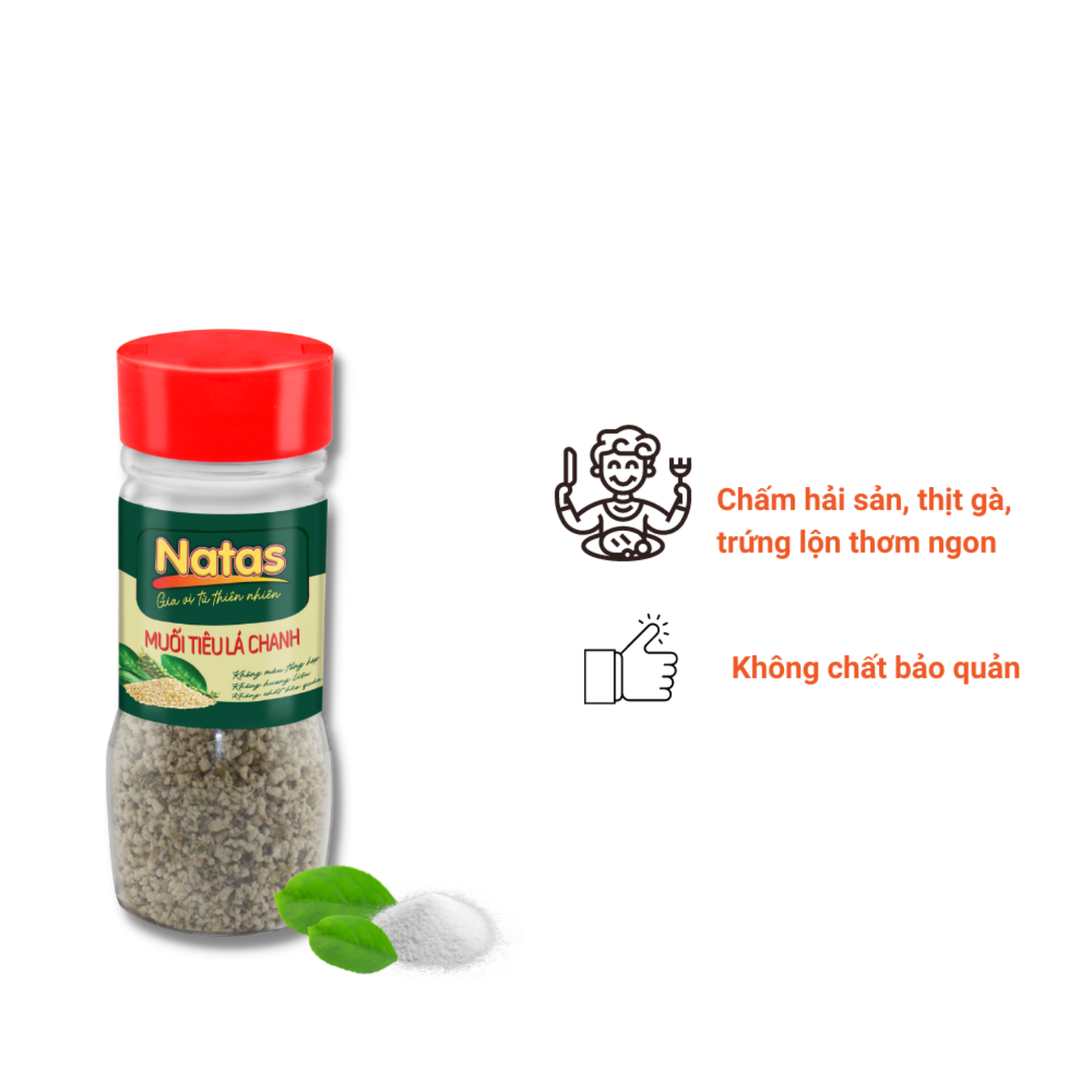 - Muối tiêu lá chanh Natas với vị muối đậm đà kết hợp lá chanh tạo nên vị đặc trưng của muối tiêu lá chanh mang lại cảm giác ngon miệng cho các món ăn.