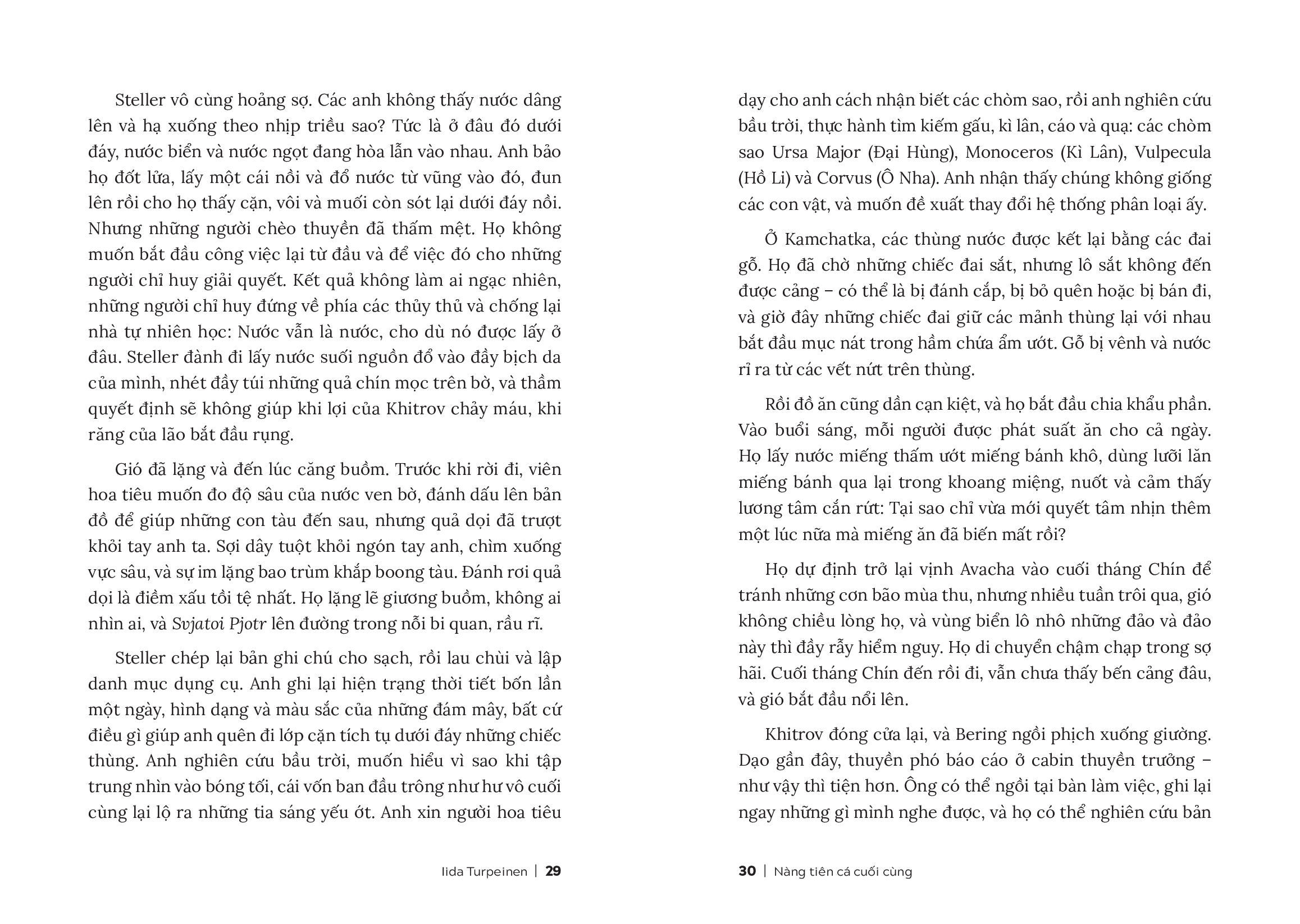 Nàng Tiên Cá Cuối Cùng là một hành trình xuyên thời gian và không gian, nơi số phận con người và tự nhiên đan xen trong những trang sử đầy ám ảnh. Cuốn sách dẫn từ chân dung của một loài vật để mở ra chuyến phiêu lưu choáng ngợp xuyên suốt ba thế kỉ, kể lại những mộng ước lớn lao của con người: về khoa học, nghệ thuật và khao khát phục sinh những gì chính tay nhân loại đã hủy diệt. Trong Nàng Tiên Cá Cuối Cùng, nhà văn Iida Turpeinen đã dẫn dắt người đọc tiến vào chuyến thám hiểm tìm hiểu những tác động của con người lên thế giới tự nhiên, trọng tâm là sự tuyệt chủng của loài bò biển Steller.