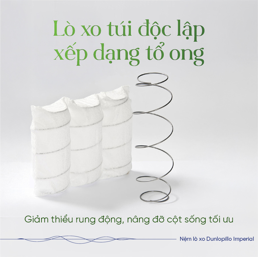 Nệm lò xo Imperial có thiết kế , sắp xếp dưới dạng so le/tổ ong. Nệm cung cấp sự hỗ trợ vượt trội, độ bền cao, giảm thiểu tối đa chuyển động cơ thể, tránh ảnh hưởng đến người nằm cạnh. Đồng thời nệm còn mang đến sự hỗ trợ vượt bậc cho cột sống.