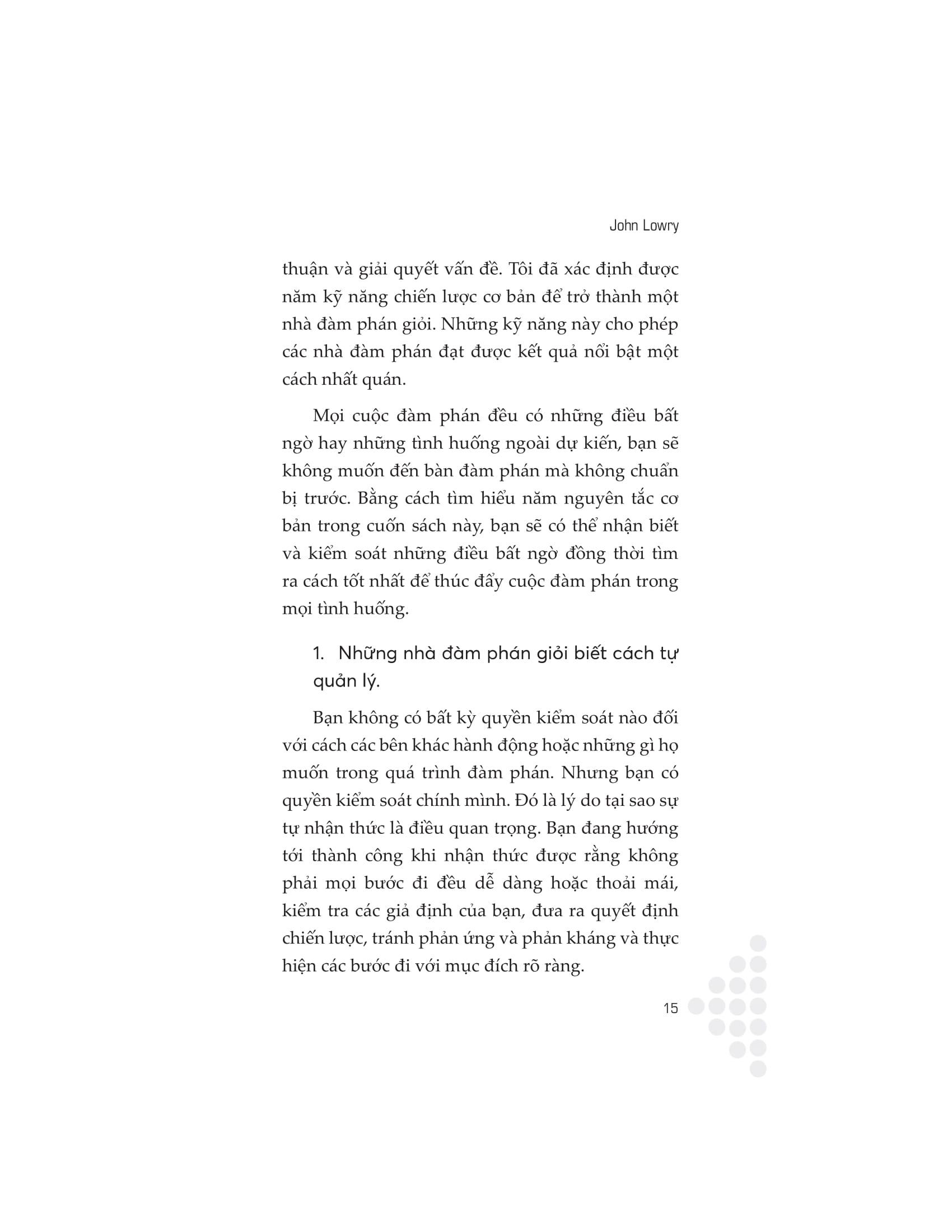 Cuốn sách này cung cấp một cách tiếp cận hữu ích và toàn diện để làm chủ cuộc đàm phán. Thông qua những lời khuyên hữu ích và hướng dẫn thực tế, tác giả John Lowry sẽ chỉ cho bạn cách gia nhập hàng ngũ những nhà lãnh đạo đã đạt được thành công chưa từng có bằng cách khiến việc thương thuyết trở nên đơn giản. Sự cần thiết của đàm phán được thể hiện trong mọi khía cạnh của đời sống, từ công việc đến cuộc sống đời thường. Phát triển kỹ năng đàm phán thuyết phục sẽ giúp bạn có thêm đạt được nhiều thành công, duy trì những mối quan hệ tốt đẹp và nâng cao hiệu quả khi giao tiếp.