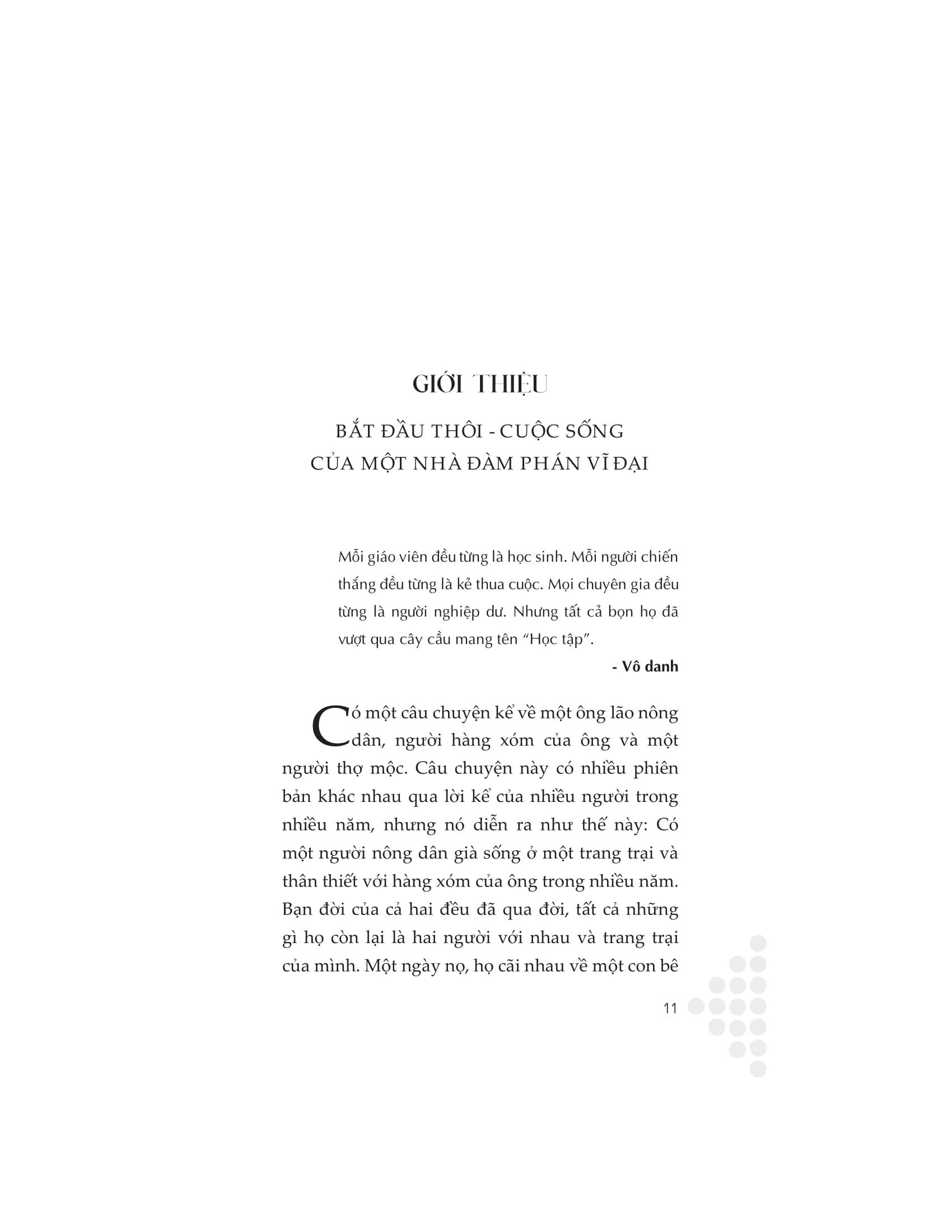 Sự thật là các nhà lãnh đạo doanh nghiệp và tổ chức dành hơn một nửa thời gian làm việc của m.ình để tham gia vào quá trình đàm phán. Đây là cách họ thực hiện các thỏa thuận, lãnh đạo nhân viên và quản lý các mối quan hệ. Hầu hết các nhà lãnh đạo học cách đàm phán trong công việc thông qua một quá trình thực hành và tự rút ra lỗi sai của m.ình. Trong thị trường cạnh tranh ngày nay, không có thời gian để thử nghiệm, cũng không có chỗ để mắc lỗi.