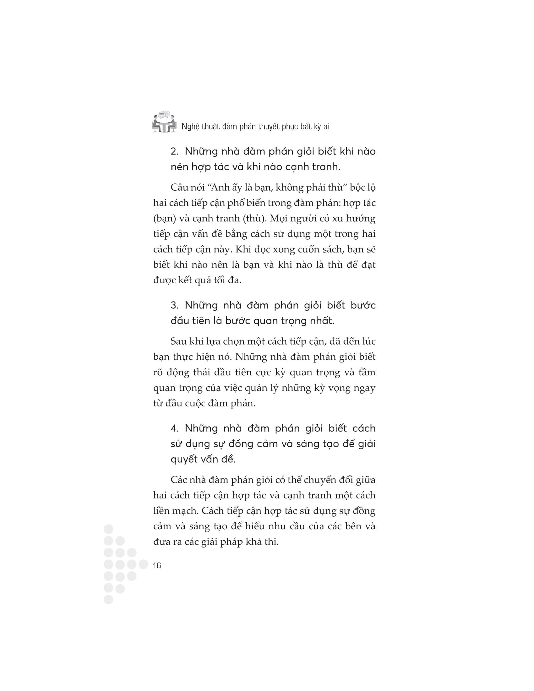 Bằng cách thành thạo đàm phán, thành công có thể dễ dàng đến gần. Lời khuyên hữu ích và hướng dẫn thực tế được đưa ra trong cuốn sách “Nghệ thuật đàm phán thuyết phục bất kì ai” cung cấp cho bạn lộ trình của mọi loại hình đàm phán. Thông qua các nghiên cứu tình huống, minh họa, bài tập và câu chuyện cá nhân, tác giả Lowry chỉ ra cách: