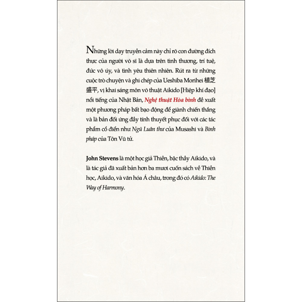 Nghệ thuật hòa bình - Những lời dạy của khai tổ Aikido Những trích dẫn trong cuốn sách này được biên soạn từ hợp tuyển các cuộc trò chuyện, thi ca, thư pháp, và từ truyền thống vấn đáp của Morihei. Mặc dù là một võ sĩ vĩ đại nhất trong lịch sử, Ueshiba Morihei là một con người của hoà bình và căm ghét mọi thứ bạo lực. Suốt đời mình, ông bị phiền não trầm trọng bởi những xung đột, chinh chiến và giao tranh. Trên hành trình truy vấn tinh thần, Morihei tin rằng sức mạnh đích thực của võ sĩ đạo, chính là tình yêu thương. Ông quy ẩn trong nước Nhật và chuyên tâm tinh luyện, truyền bá Aikido - có thể hiểu là Nghệ thuật Hoà Bình. Từ những lời dạy hướng con người vào bên trong, chỉ rõ con đường chân chính của người võ sĩ là dựa trên tình thương, trí tuệ, đức vô uý, và tình yêu thiên nhiên, Nghệ thuật Hoà Bình chính là cuốn sách gối đầu giường không thể thiếu của mọi môn sinh Aikido. Không chỉ là một dẫn nhập về sư tổ Aikido với rất nhiều huyền thoại, mà quan trọng hơn, Nghệ thuật Hoà Bình có thể giải đáp những hiểu lầm từ trước đến nay về môn võ Hiệp khí đạo. Người đọc sẽ tự tìm thấy câu trả lời cho những câu hỏi vẫn luôn gây nhiều tranh cãi và ngộ nhận: tinh thần của Aikido là gì; vì sao Aikido không có thi đấu; Aikido khác biệt với những môn võ còn lại như thế nà Nếu như các tác phẩm cổ điển Ngũ Luân Thư của Mubashi hay Binh Pháp của Tôn Vũ tử thừa nhận chiến tranh là điều không thể tránh khỏi thì Nghệ thuật Hoà Bình của Morihei thuyết phục chúng ta về sự vô nghĩa của hơn thua, tranh đấu. "Bạn không cần phải là một môn sinh hay võ sĩ Aikido mới thấu hiểu giá trị từ những thông điệp truyền cảm trong ngôn từ của Ueshiba. Ueshiba tin rằng võ sĩ đạo chân chính là dựa vào tình thương, trí tuệ, đức vô úy, và tình yêu thiên nhiên; vì vậy những lời dạy của ông không chỉ dành riêng cho giới võ sĩ, mà là của toàn nhân loại.” - Qi Journal “Cuốn sách này là một “thứ cần phải có” đối với tất cả môn sinh về triết học của Osensei [Đại tiên sinh] và vì thế tôi sẽ nói – cho toàn thể gia đình Aikido [Aikidoka].” - Aikido Today VỀ TÁC GIẢ: JOHN STEVENS (Sinh năm 1947) Là học giả Thiền, tu sĩ Phật giáo, và là bậc thầy Aikido. Ông sinh ra tại Chicago, đến Sendai (Nhật Bản) vào năm 1973 để nghiên cứu Phật giáo và thực hành Aikido dưới sự hướng dẫn của Hanzawa Yoshimi và Shirata Rinjiro. Stevens đạt tới cấp bảy đẳng Akikai. John Stevens đã sáng tạo ra hệ thống Aikido riêng gọi là Aikido cổ điển và đã truyền bá trên toàn thế giới. Hệ thống này chú trọng đến nghi thức thanh lọc thân-tâm, sức mạnh huyền bí của ngôn từ và âm thanh và sự thống nhất của hiệp khí kiếm thuật. Trong 40 năm sinh sống tại Nhật, ông từng là giáo sư môn Triết học Đông phương tại Viện đại học Tohoku Fukushi; đã biên soạn và xuất bản hơn 30 cuốn sách về Thiền học, Aikido, Judo, và văn hoá Á châu, trong đó có Aikido: The Way of Harmony.