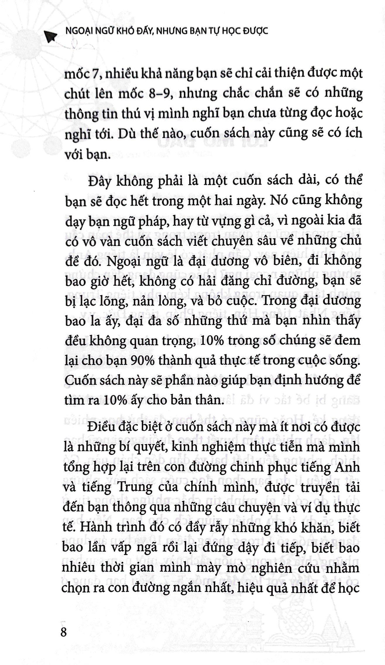 Đây không phải là một cuốn sách dài, nên có thể bạn sẽ đọc hết trong một hai ngày. Nó cũng không dạy bạn ngữ pháp, hay từ vựng gì cả, vì ngoài kia đã có vô vàn cuốn sách viết chuyên sâu về những chủ đề đó. Ngoại ngữ là đại dương vô biên, đi không bao giờ hết, không có hải đăng chỉ đường, bạn sẽ bị lạc lõng, nản lòng, và bỏ cuộc. Trong đại dương bao la ấy, đại đa số những thứ mà bạn nhìn thấy đều không quan trọng, 10% trong số chúng sẽ đem lại cho bạn 90% thành quả thực tế trong cuộc sống. Cuốn sách này sẽ phần nào giúp bạn định hướng để tìm ra 10% ấy cho m.ình.
