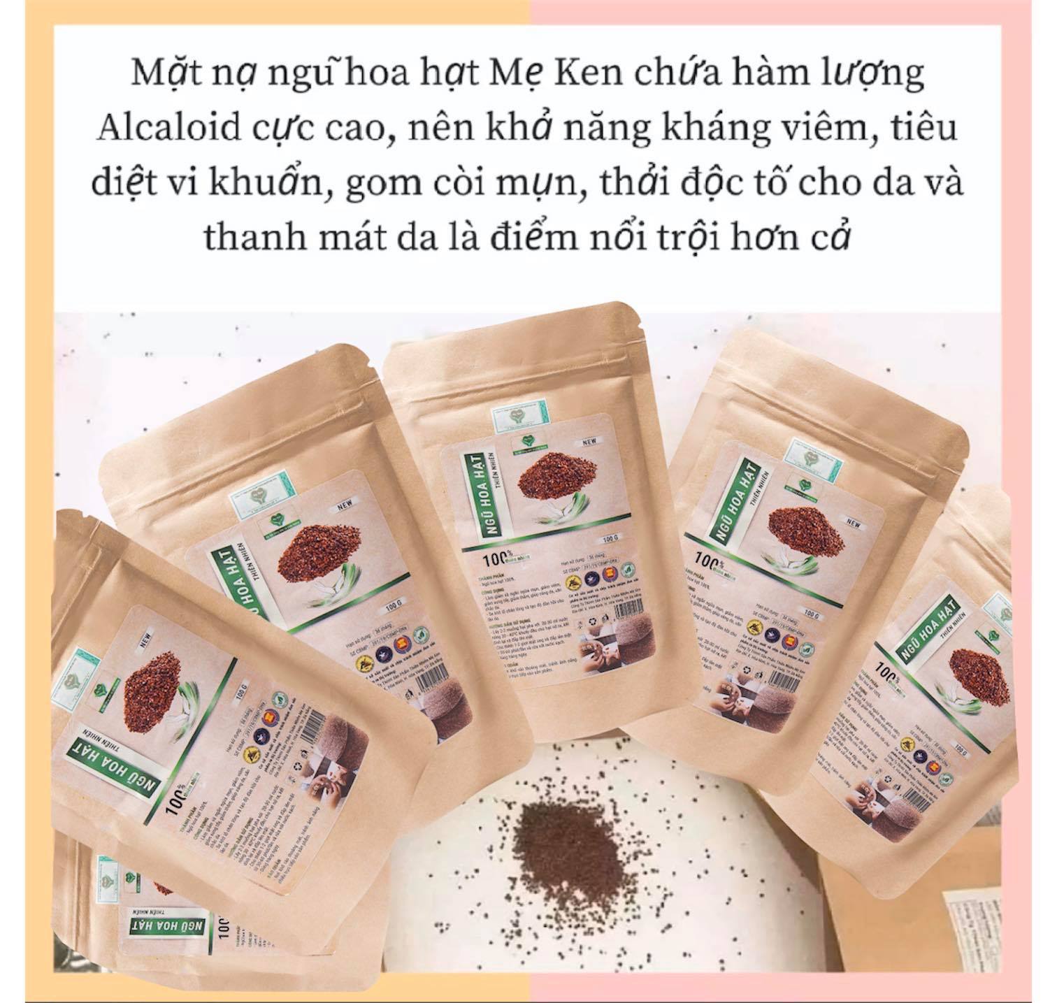 NGŨ HOA HẠT MẸ KEN Ngũ hoa hạt là khắc tinh của mụn nhọt, giúp loại bỏ mụn một cách nhanh chóng, an toàn, đồng thời dưỡng da mịn màng và căng sáng hơn. CÔNG DỤNG:  Se khít lỗ chân lông, giảm lượng dầu dư thừa trên da, hỗ trợ điều trị các loại mụn, thậm chí là mụn lâu năm.  Làm mờ thâm do mụn, nám, tàn nhang  Tăng độ đàn hồi cho da, giúp da căng bóng và mịn màng. Giảm cơn đau đầu, chóng mặt CÁCH SỬ DỤNG NGŨ HOA HẠT ĐỂ HỖ TRỢ ĐIỀU TRỊ MỤN: Chỉ cần lấy khoảng 2 thìa ngũ hoa hạt, trộn với 20-30ml nước ấm khấy đầu để hạt nở ra thành hỗn hợp sệt, có thể cho thêm ít giọt mật ong vào sau đó đắp lên mặt và thư giãn trong khoảng 30-60 phút, đến khi mặt nạ gần khô thì rửa sạch với nước. Kiên trì thực hiện sẽ thấy tình trạng mụn cải thiện, da sáng và mịn màng hơn. ĐẮP TUẦN 1-2 LẦN THƯ GIÃN DA HOẶC CÓ THỂ ĐẮP MỖI NGÀY ĐỂ DA ĐẸP MỊN LÊN TRÔNG THẤY KẾT NHỚ HỢP TẨY DA CHẾT CHO MẶT NHA CHỊ EM