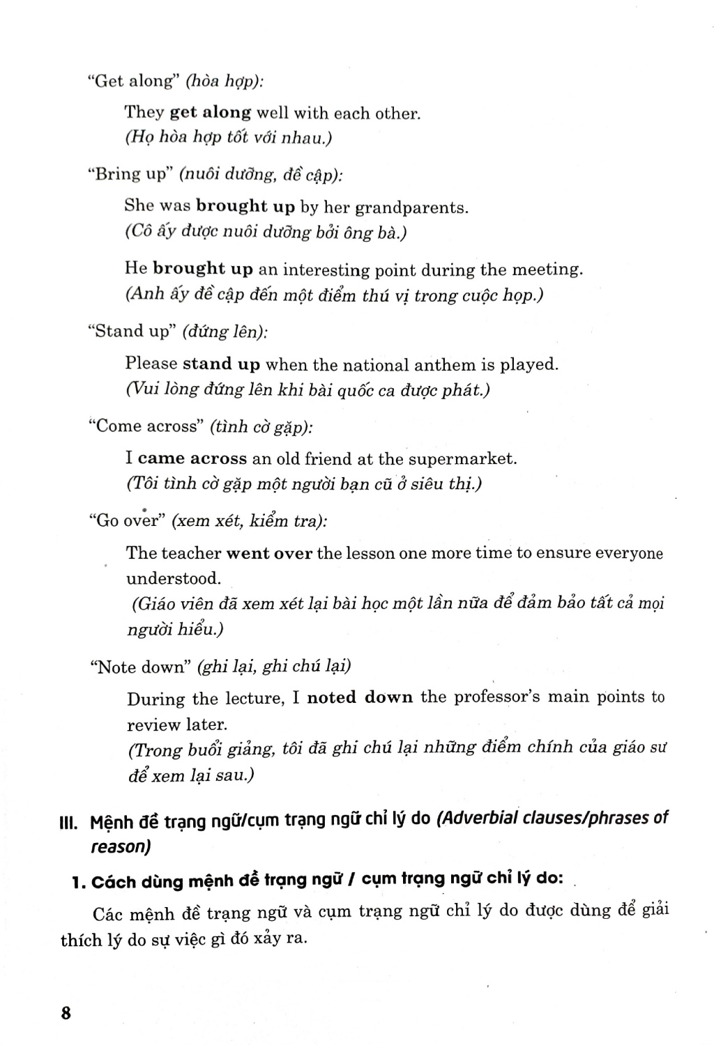 Sách bao gồm nhiều chủ điểm ngữ pháp và bài tập thực hành để các em học tập, rèn luyện và trau dồi kiến thức ngữ pháp tiếng Anh. Các chủ điểm ngữ pháp bám sát nội dung trong sách giáo khoa, ngoài ra còn được mở rộng thêm để các em nắm vững hơn về cách dùng động từ nguyên mẫu có to (to-infinitive); Cụm động từ (Phrasal verb); Mệnh đề trạng ngữ/cụm trạng ngữ chỉ lý do (Adverbial clauses/phrases of reason); Ôn tập về cách dùng “Would”; Cách dùng “Used to”; Mệnh đề quan hệ xác định (defining relative clause) với đại từ quan hệ.; Cách dùng “wish” với thì quá khứ đơn (past simple); Câu tường thuật (Reported speech); Cách dùng “could” và các từ hỏi (wh-words) trước to-infinitive; Cách dùng suggest + gerund (danh động từ); Mệnh đề trạng ngữ/cụm từ chỉ sự nhượng bộ; Cấu trúc so sánh hơn với các từ nhấn mạnh; Cách dùng cấu trúc động từ + danh động từ (verb + gerund); Cách dùng mệnh đề quan hệ không xác định; Thì quá khứ tiếp diễn (Past Continuous); Cách dùng các mệnh đề trạng ngữ chỉ kết quả (adverbial clauses of result); Câu điều kiện loại 1 với động từ khiếm khuyết (First Conditional with modal verbs); Cách dùng cấu trúc “Động từ + to infinitive”.