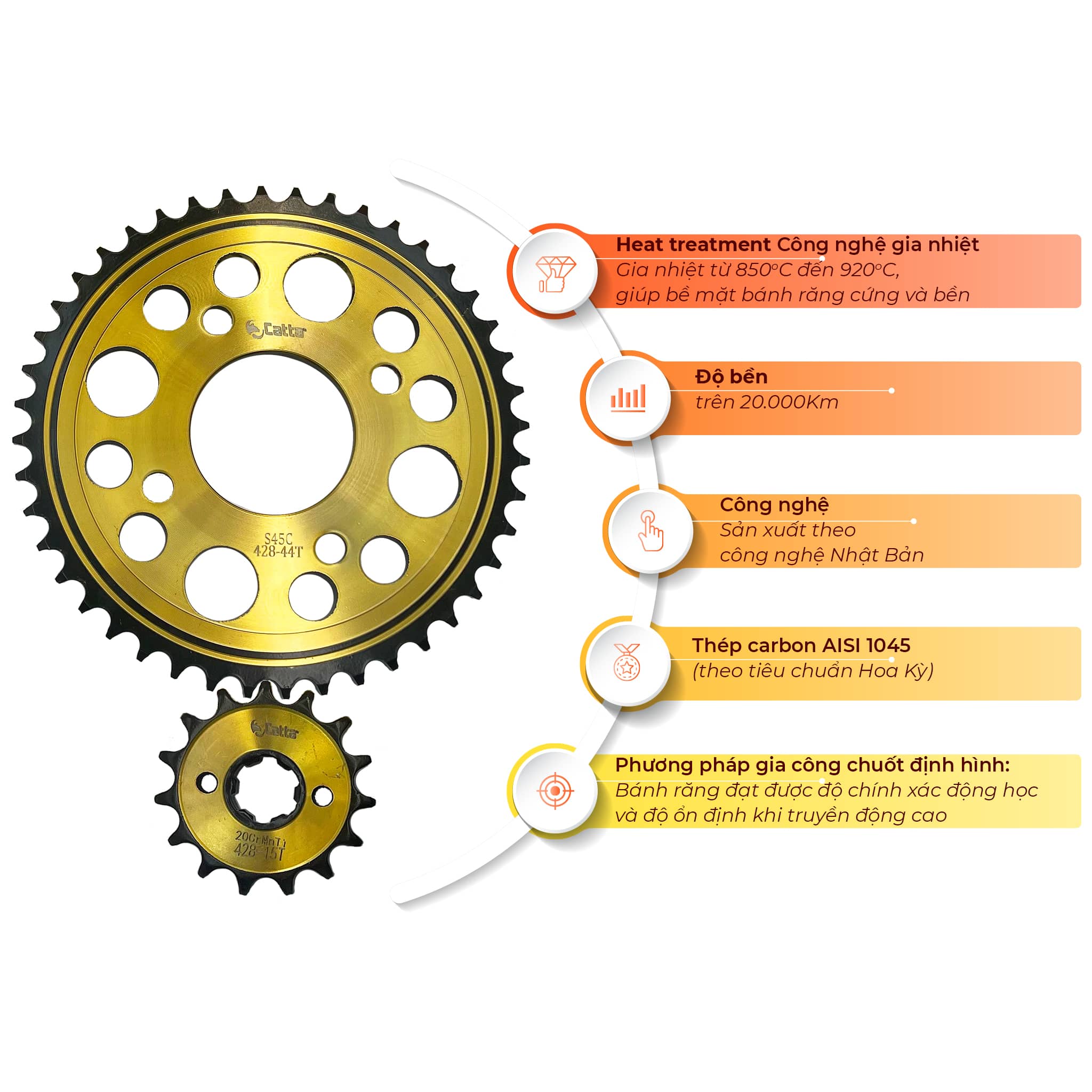 BỘ NHÔNG SÊN DĨA EXCITER (2006 - 2010) THƯƠNG HIỆU CATTA SPARE PARTS Nhông sên dĩa Exciter (bộ nhông xích Exciter) thương hiệu CATTA Spare Parts được sản xuất từ thép carbon S45C chuyên dụng