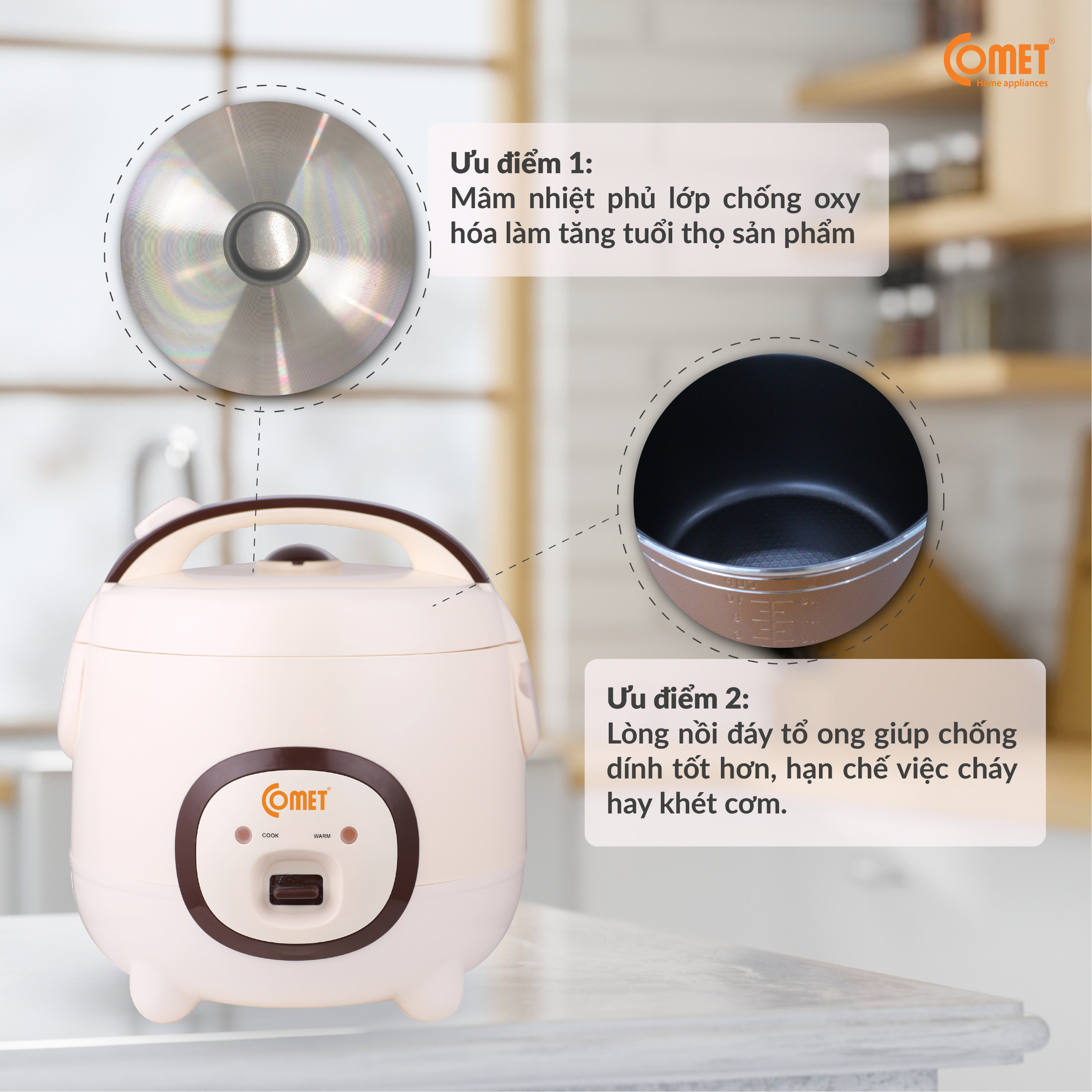 Mua tại Tiktok1.THÔNG TIN SẢN PHẨM NỒI CƠM ĐIỆN CON HEO COMET CM8007 Nồi cơm điện CM8007 - Dung tích 1.8L là một thiết bị điện gia dụng giúp hỗ trợ người dùng có bữa cơm ngon mà lại nhanh chóng, tiện lợi. Đây là một trong những giải pháp thông minh giúp người dùng vừa có thể tiết kiệm thời gian nấu nướng mà vẫn giữ được chất dinh dưỡng của sản phẩm. Từ trước đến nay, những chiếc nồi cơm điện luôn gắn bó, trở thành vật dụng quen thuộc của các gia đình từ thành thị đến nông thôn, nhờ có nhiều ưu điểm như lòng nồi kín, giữ nhiệt lâu, đa dạng chế độ nấu… Tuy có nhiều tính năng ưu việt, nhưng việc chọn lựa và mua nồi phù hợp cho gia đình chưa bao giờ là dễ dàng. Cùng điểm qua các chức năng của Nồi cơm điện CM8007 - 1,8L 3.ĐẶC ĐIỂM SẢN PHẨM: