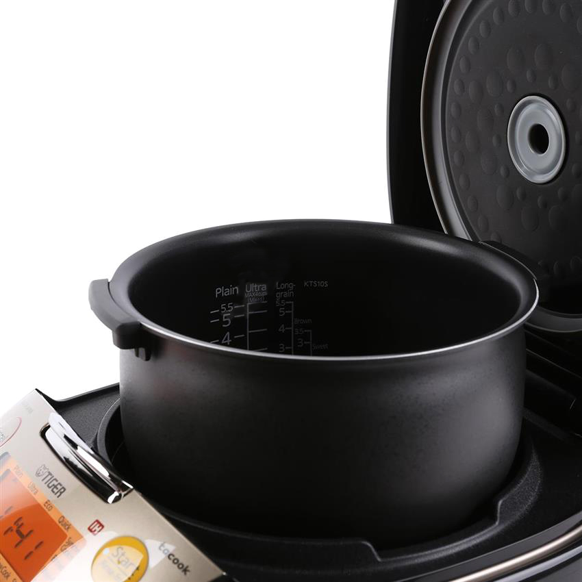 Nồi cơm điện tử cao tần Tiger JKT-S18W chính hãng giúp tô điểm không gian bếp nhờ chất liệu cao cấp, toát lên sự sang trọng, đẳng cấp. Cụ thể phần thân nồi được làm từ chất liệu inox có độ sáng bóng đẹp, màu nâu viền đen vô cùng hài hòa. Lòng nồi 5 lớp kim loại tráng 3 lớp men chống dính cao cấp, có tác dụng chống dính hiệu quả, giúp cơm nấu ngon hơn và dễ dàng vệ sinh sau khi sử dụng.