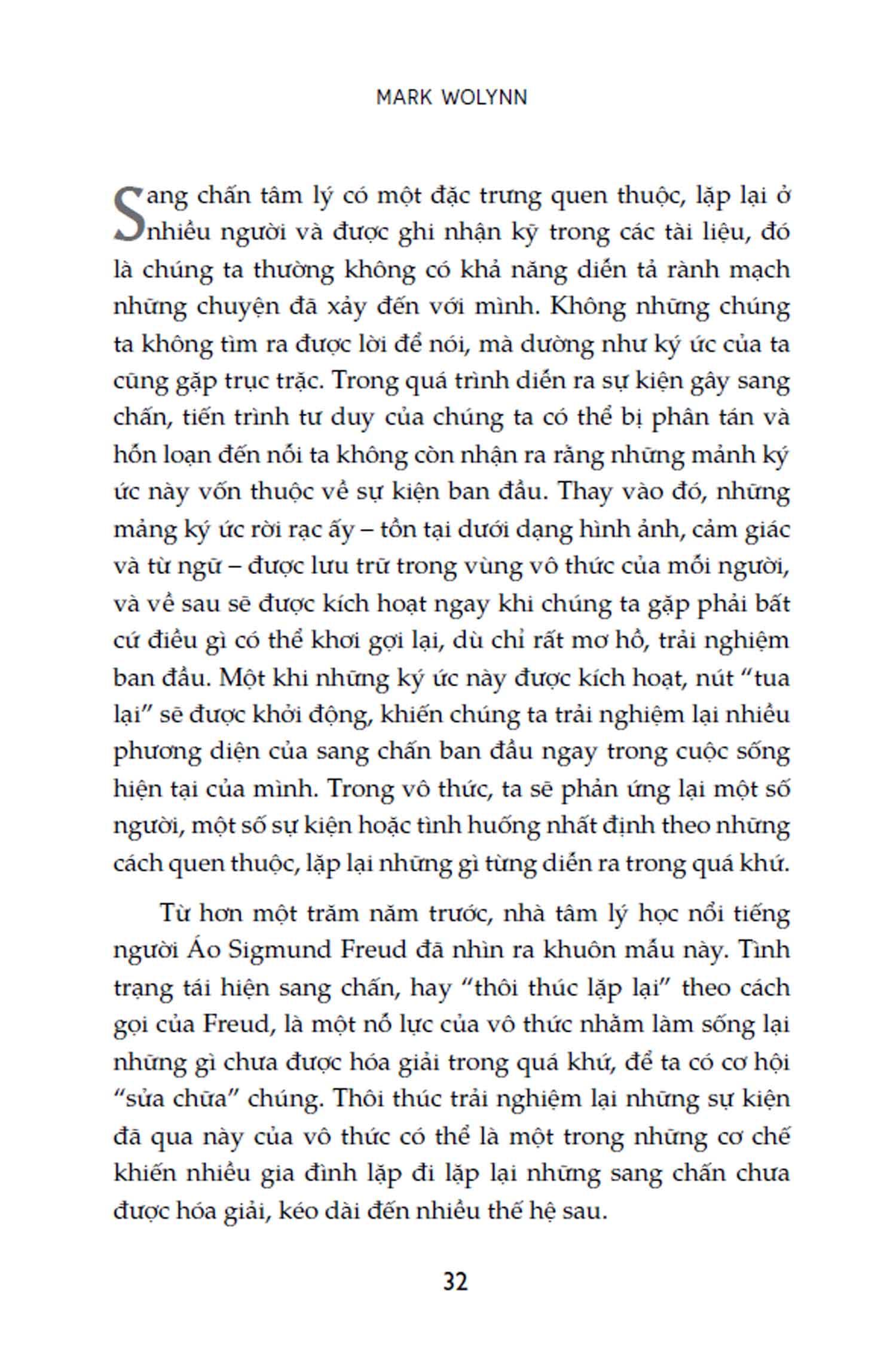 • “Cuốn sách mang tính đột phá này cung cấp những kiến thức vô cùng thuyết phục về chấn thương liên thế hệ cũng như những công cụ mới lạ và mạnh mẽ để làm giảm bớt nỗi đau đó. Mark Wolynn thực sự là một người hướng dẫn khôn ngoan và đáng tin cậy trên hành trình chữa lành này.” – Tiến sĩ Tara Brach, tác giả cuốn Radical Acceptance and True Refuge.