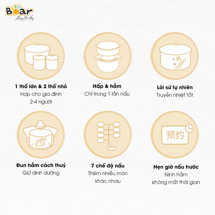 Nồi nấu chậm kèm lồng hấp Bear DDZ-D16J3 (SUBE002) được tích hợp nhiều tính năng nấu và hầm tiện lợi, giúp bạn làm nhiều món ăn khác nhau như: hấp, hầm, chưng yến, nấu cháo,