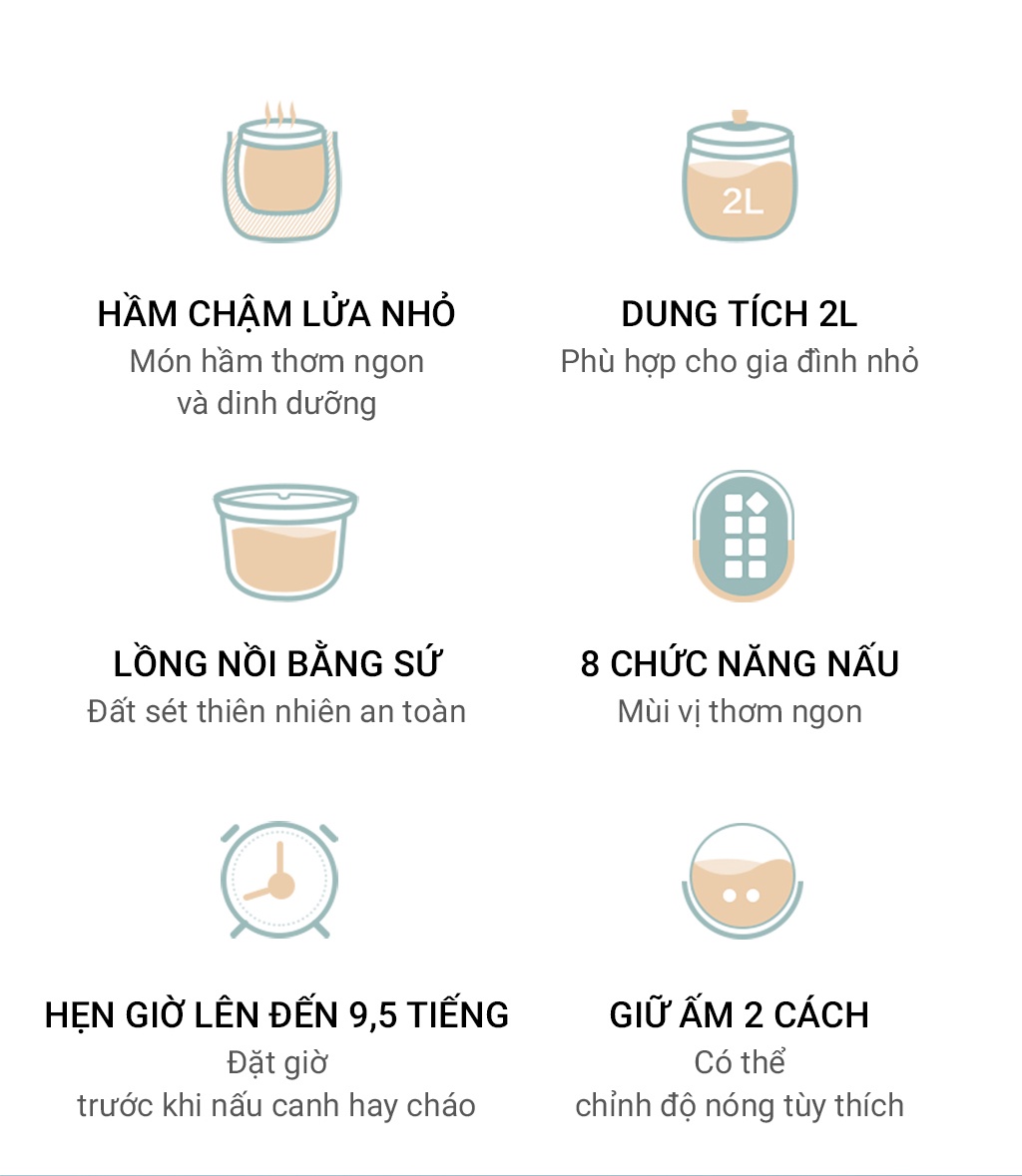 Đặc điểm nổi bật - Dung tích 3 lít thích hợp sử dụng nấu cháo, súp, món ninh/hầm,... cho trẻ nhỏ, người già. - Công suất 255W kết hợp phương pháp gia nhiệt quanh lòng nồi, chế