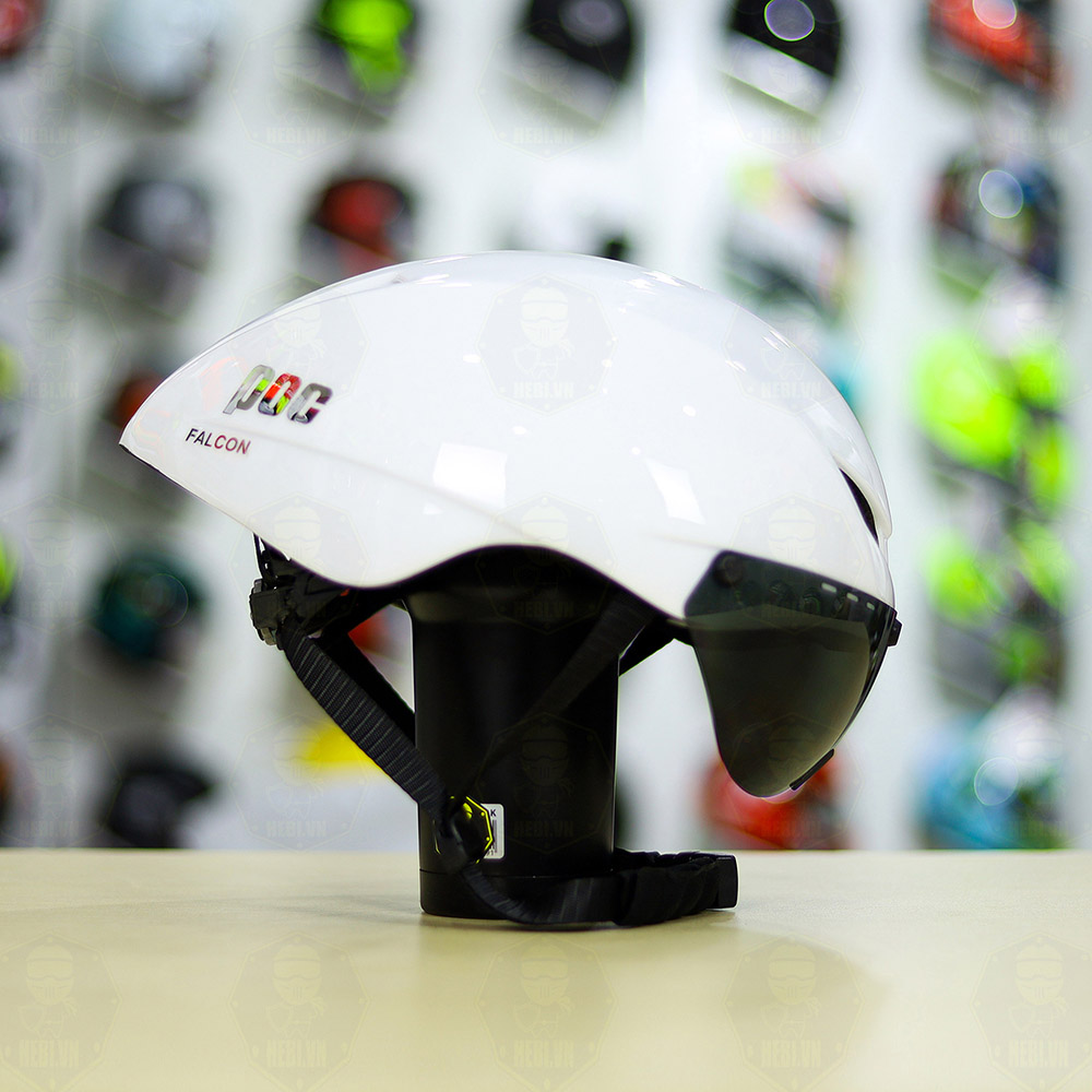 Là anh em sinh đôi với P.01, POC Falcon có thiết kế kiểu dáng giống đến 95% P.01. Khác biệt so với P01 ở phần đuôi POC Falcon ngắn hơn nên giúp người ngồi phía sau đảm bảo an toàn. Tô vẽ cho sự khác biệt ở POC Falcon là chiếc kính, kính này các bạn có thể láo lắp dễ dàng. Vì thiết kế tiện dụng ba chốt hít nam châm giữ kính. Tuy kính được giữ cố định bằng lực hít nam châm nhưng giữ khá tốt chịu được lực tác động mạnh, kính có khả năng bảo vệ lọc tia UV, bụi vào mắt. Thêm một điểm cộng cho mũ này vì thiết kế có nút điều chỉnh size phía sau mũ, đội vừa vặn cho nhiều vòng đầu khác nhau.