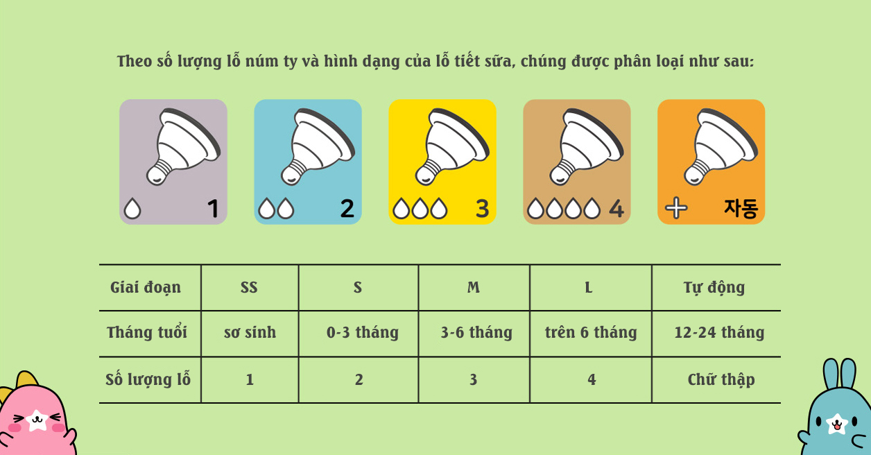 - Chia 5 giai đoạn theo quá trình phát triển của bé: Lỗ tiết được chia thành năm giai đoạn theo lượng sữa của từng tuổi.